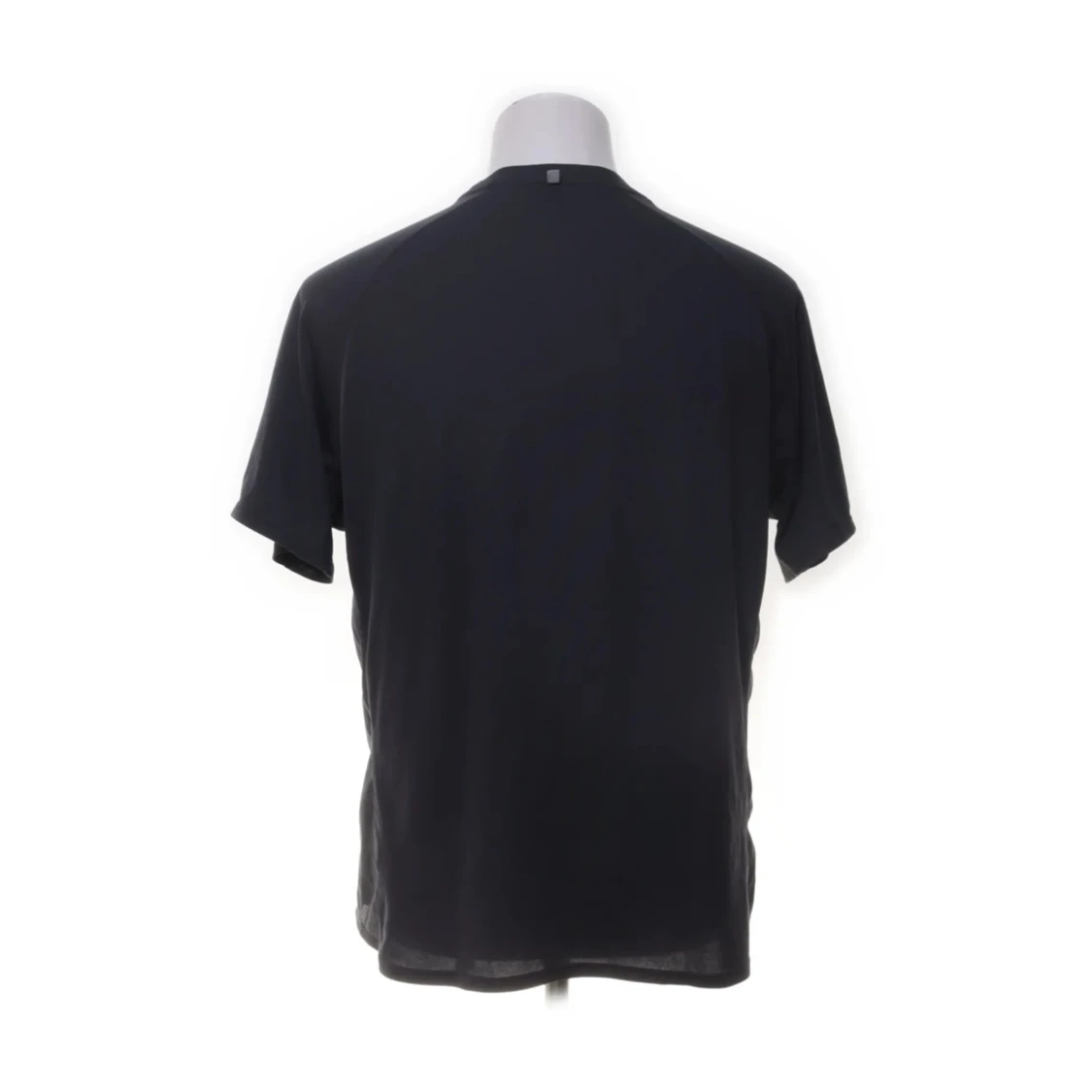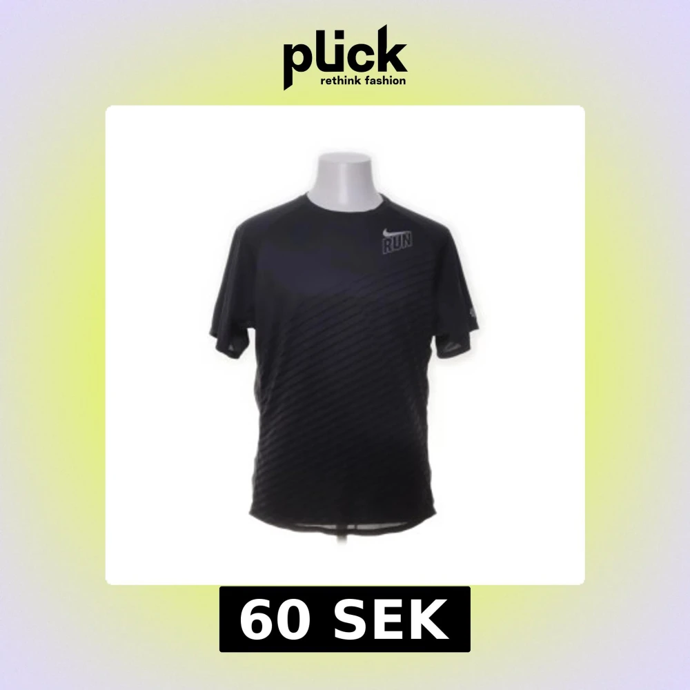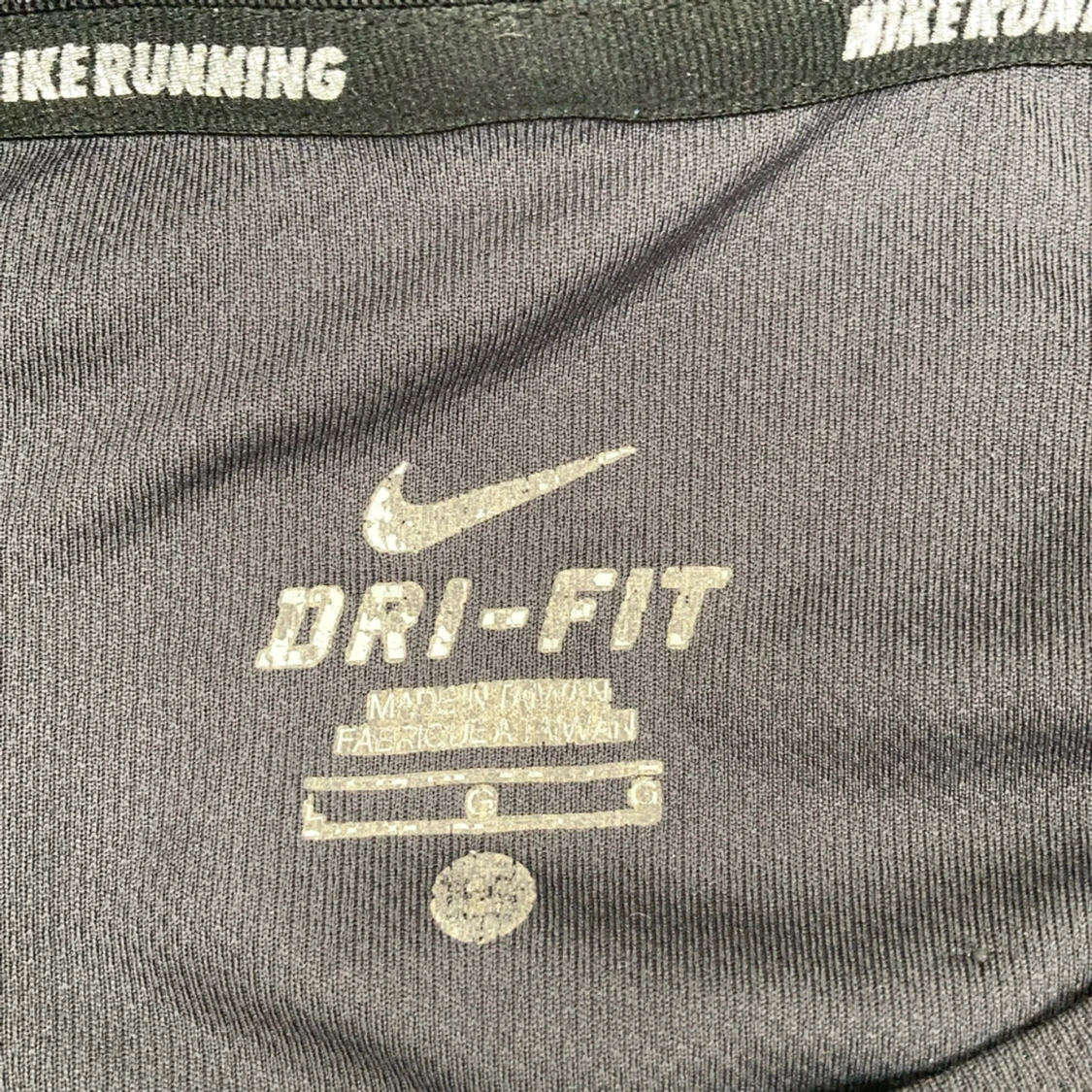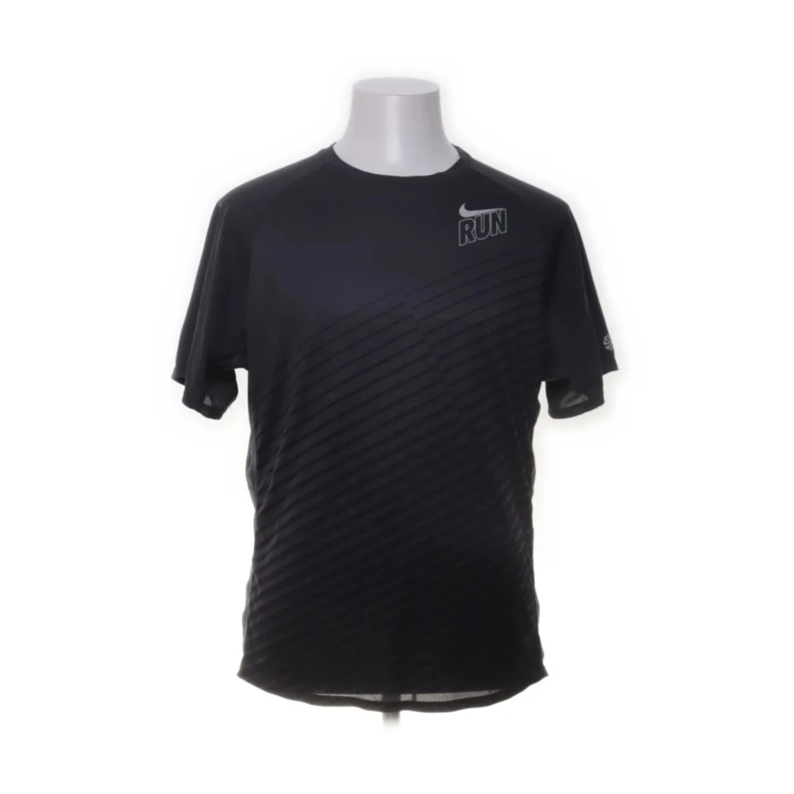 Svart Nike Dri-Fit t-shirt med RUN-tryck på bröstet och diskreta diagonala ränder framtill. Tillverkad i ett lätt och ventilerande syntetmaterial som passar perfekt för löpning. Klassisk passform med korta ärmar och rund hals.