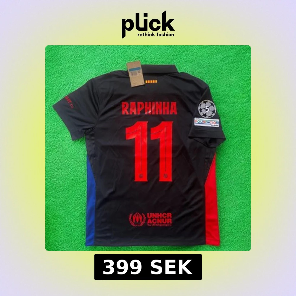 Snygg FC Barcelona fotbollströja med Raphinha och nummer 11 i rött på ryggen. Svart bas med röda och blå sidopaneler, officiella Champions League och Foundation-patch på ärmen samt Spotify-logga på bröstet. Tillverkad i lätt och ventilerande polyester.