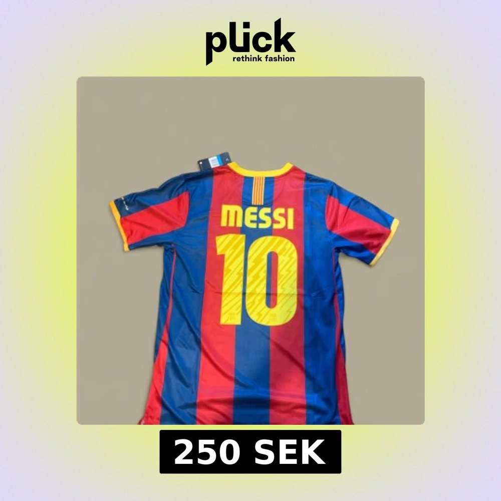 Säljer en FC Barcelona fotbollströja från Nike med Messi och nummer 10 på ryggen. Tröjan har klassiska blå och röda vertikala ränder, gula detaljer och klubbmärke på bröstet. Tillverkad i lätt, ventilerande Dri-FIT polyester. Perfekt för dig som älskar Barca och Messi.