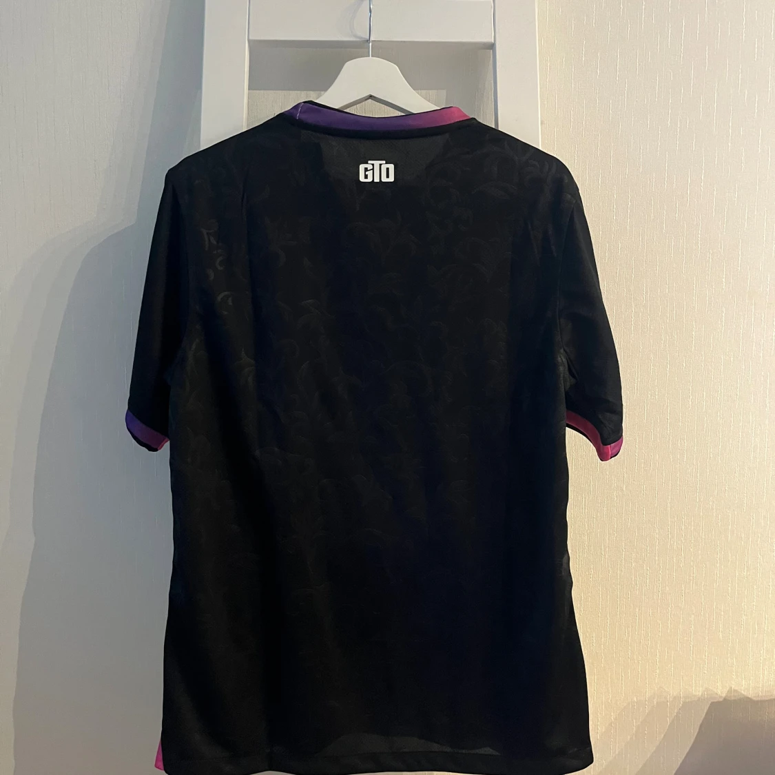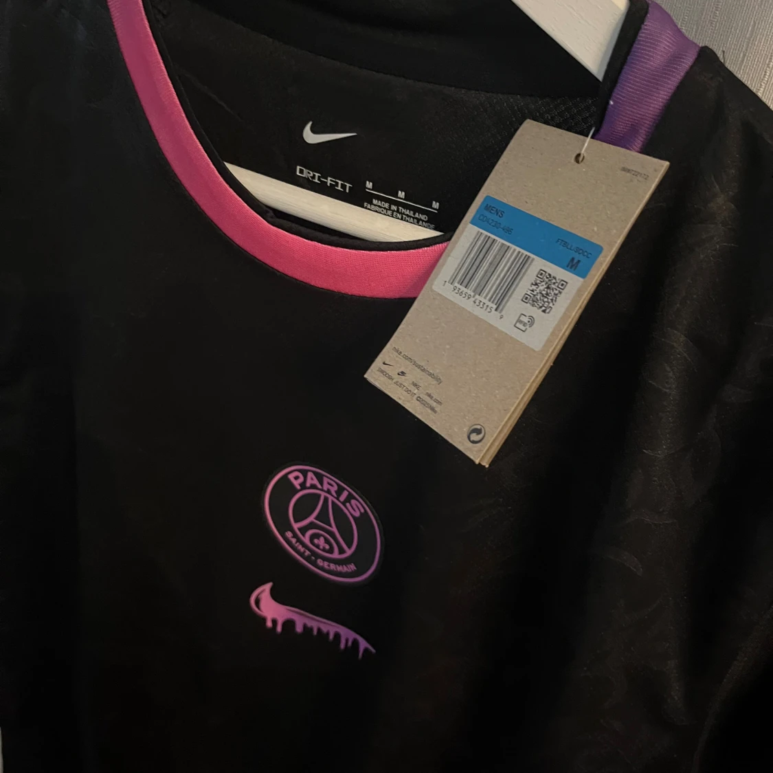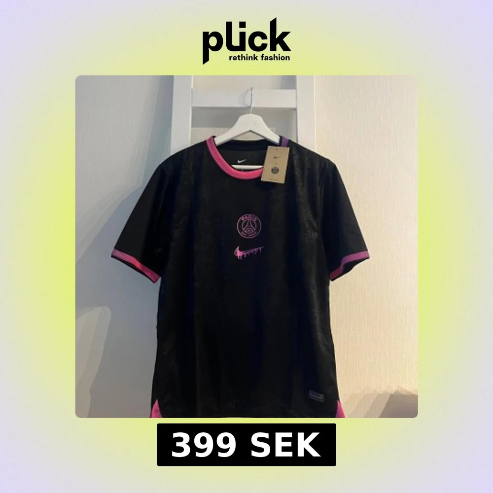 Svart PSG fotbollströja från Nike med rosa och lila detaljer på krage och ärmslut. Paris Saint-Germain-logga och unik rosa Nike swoosh framtill. Tillverkad i lätt Dri-FIT-material som andas. Perfekt för dig som vill sticka ut på planen.
