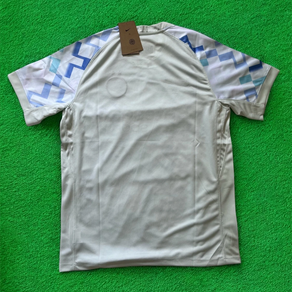 Snygg Inter Milan fotbollströja från Nike i vit med ljusblå och marinblå geometriskt mönster. Kortärmad modell med rund hals och tryckt sponsorlogga på bröstet. Materialet är lätt och andas, perfekt för träning eller match. Klubbmärket och Nike-loggan är broderade.