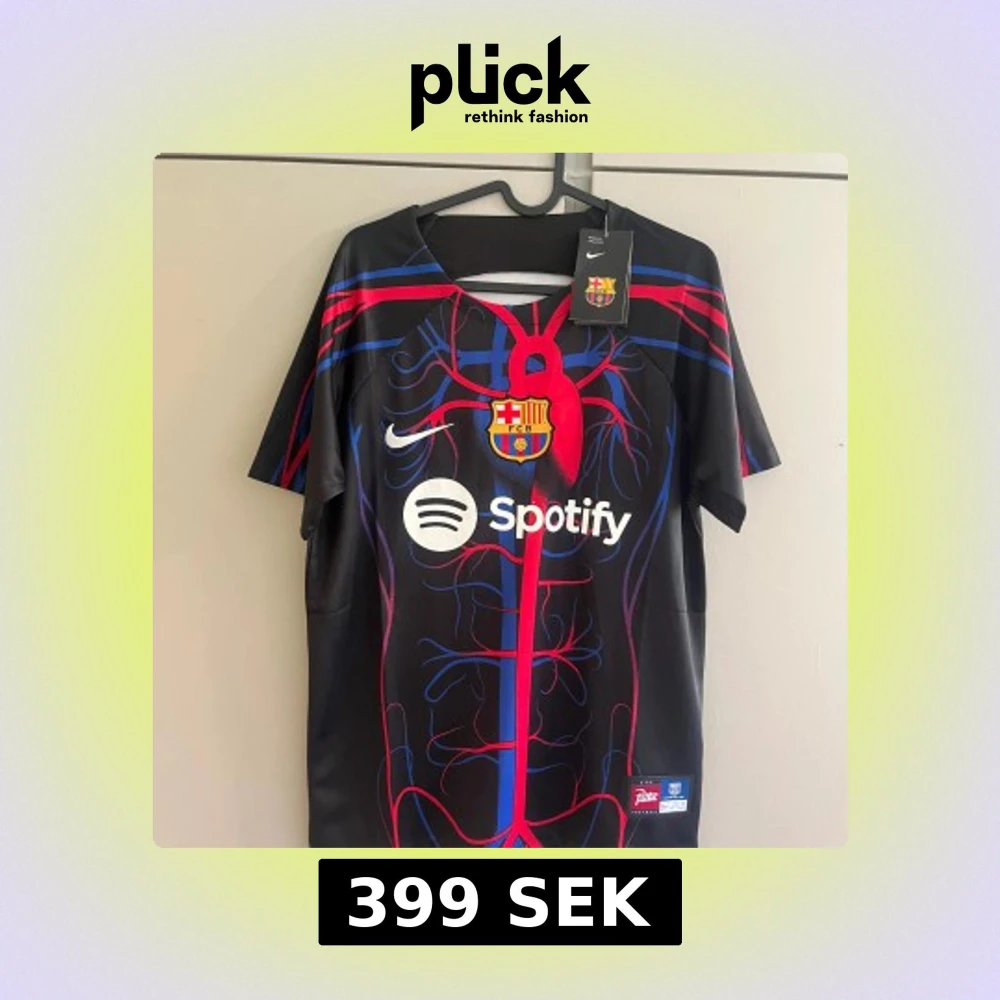 Unik FC Barcelona x Nike Patta fotbollströja med svart bas och färgstarka blå och röda ådror samt hjärtmotiv på bröstet. Stort FCB-emblem, Nike-logga och Spotify-sponsor framtill. Tillverkad i lätt och ventilerande material, perfekt för match eller träning.