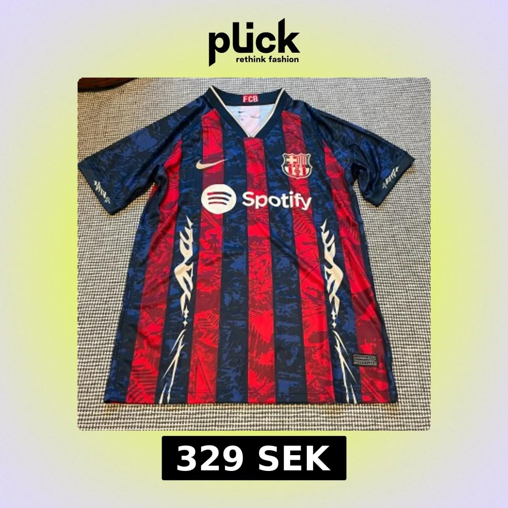 FC Barcelona matchtröja från Nike med klassiska blå och röda vertikala ränder, klubbmärke på bröstet och Spotify-logga. Tillverkad i lätt och ventilerande Dri-FIT-material, kortärmad med V-ringning och gulddetaljer.