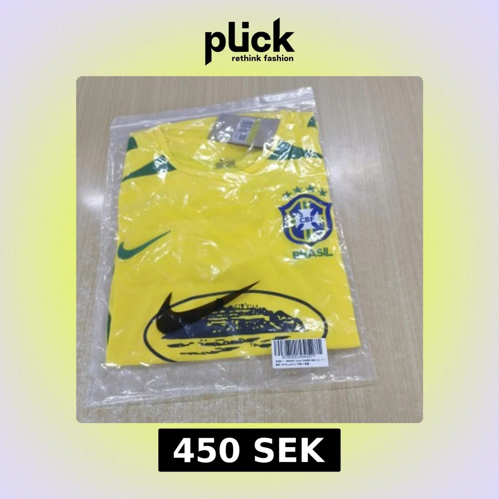 Gul Brasilien fotbollströja från Nike i storlek S. Tröjan har gröna detaljer på sidorna och axlarna, CBF-emblem på bröstet och Nike-logga. Tillverkad i lätt och ventilerande polyester, perfekt för match eller träning.