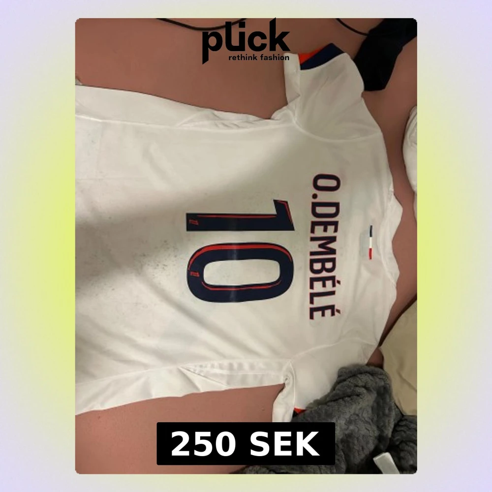 Paris Saint-Germain fotbollströja med O. Dembélé och nummer 10 på ryggen. Vit bas med blå och röda penseldrag, PSG-emblem och Qatar Airways-tryck på bröstet. Tillverkad i lätt Dri-Fit-material, kortärmad och med klassisk rund hals. Pris kan såklart diskuteras🤩