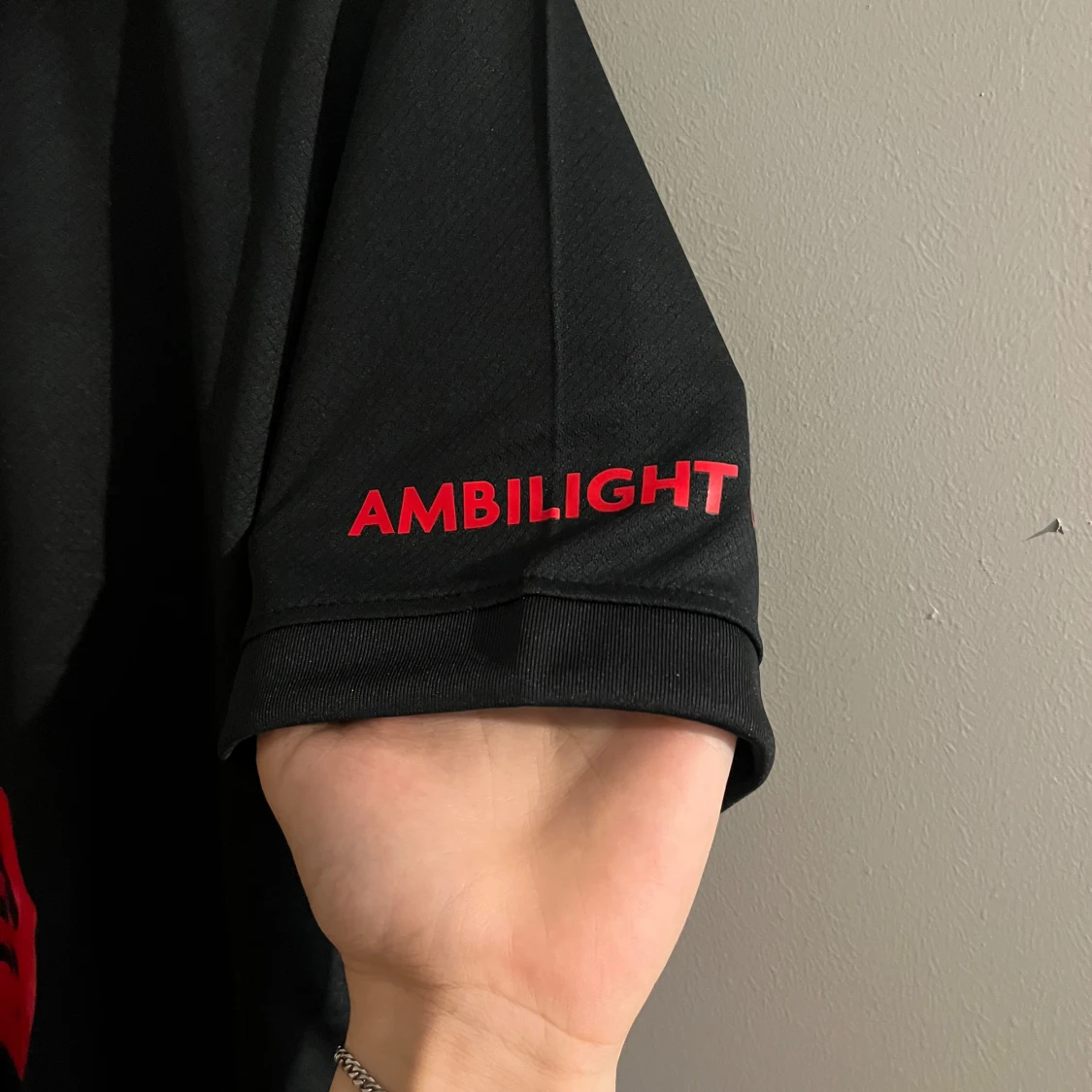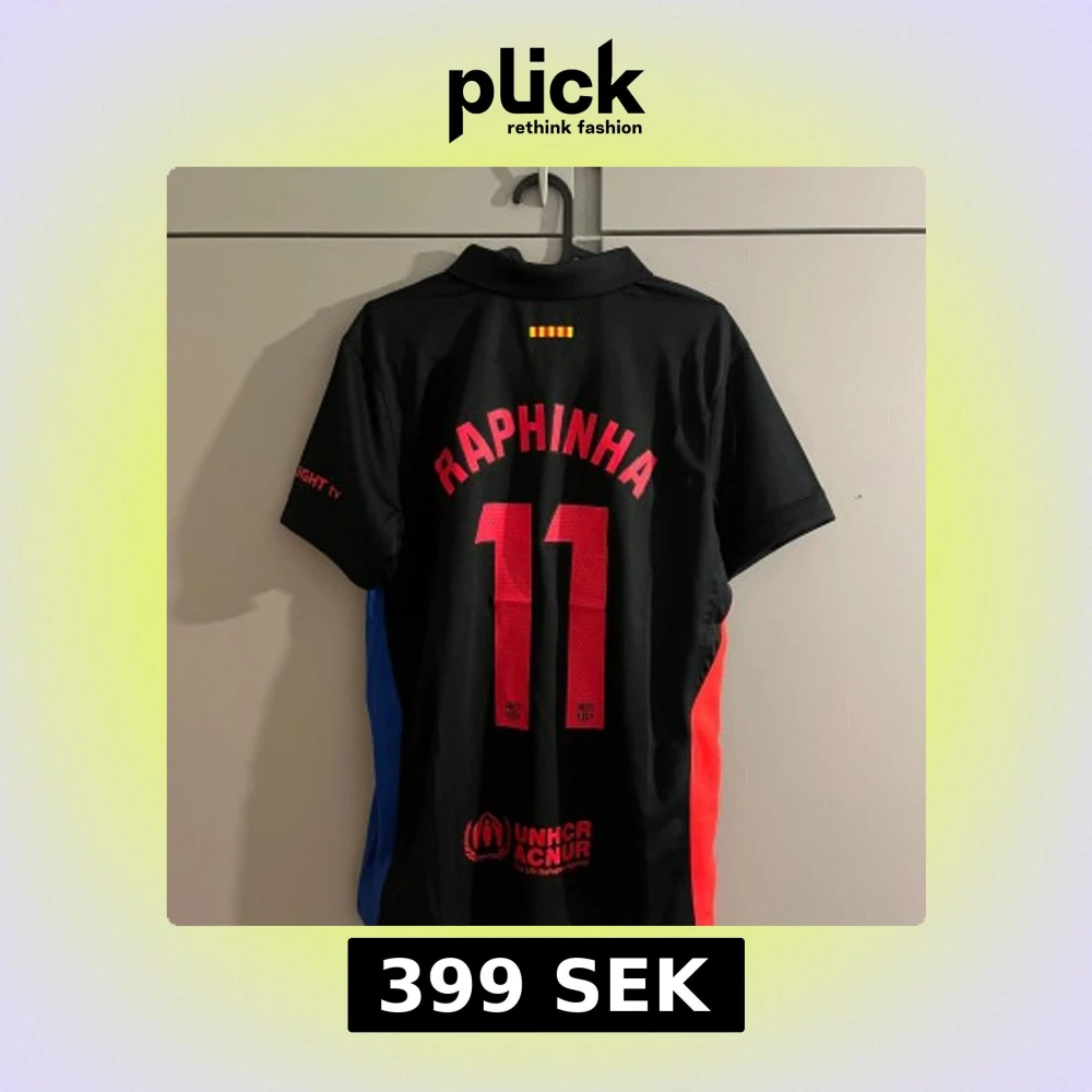 Säljer en svart FC Barcelona fotbollströja med Raphinha 11 på ryggen. Tröjan har röda och blå detaljer på sidorna, klubbmärke och Nike-logga på bröstet samt Spotify-logga. Kortärmad modell med trycket 'AMBILIGHT' på ärmen.