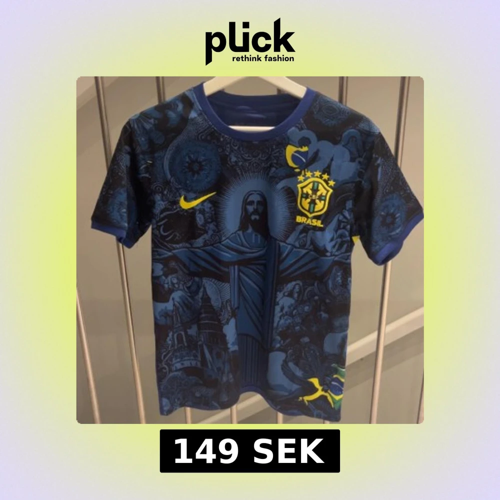 Snygg blå fotbollströja från Nike med Brasilien-tema, tröjan är 9/10 skick använd fåtal gånger, Tröjan har ett unikt mönster med Jesus statyn och andra detaljer i olika blå nyanser. Riktigt fet och har det ikoniska Nike-loggan i gult på framsidan.