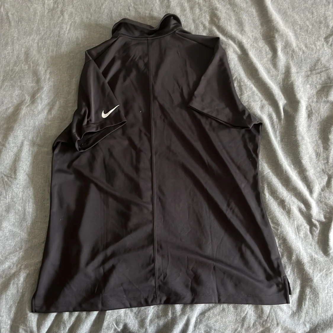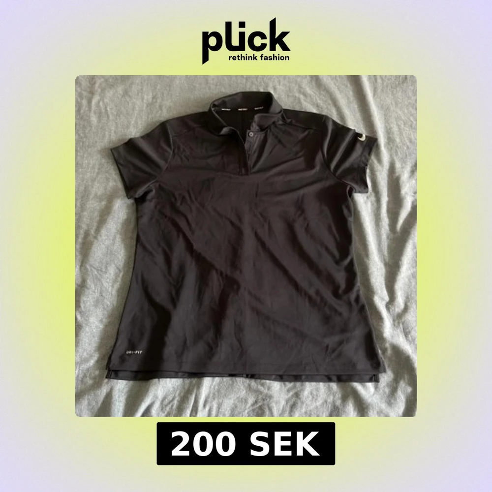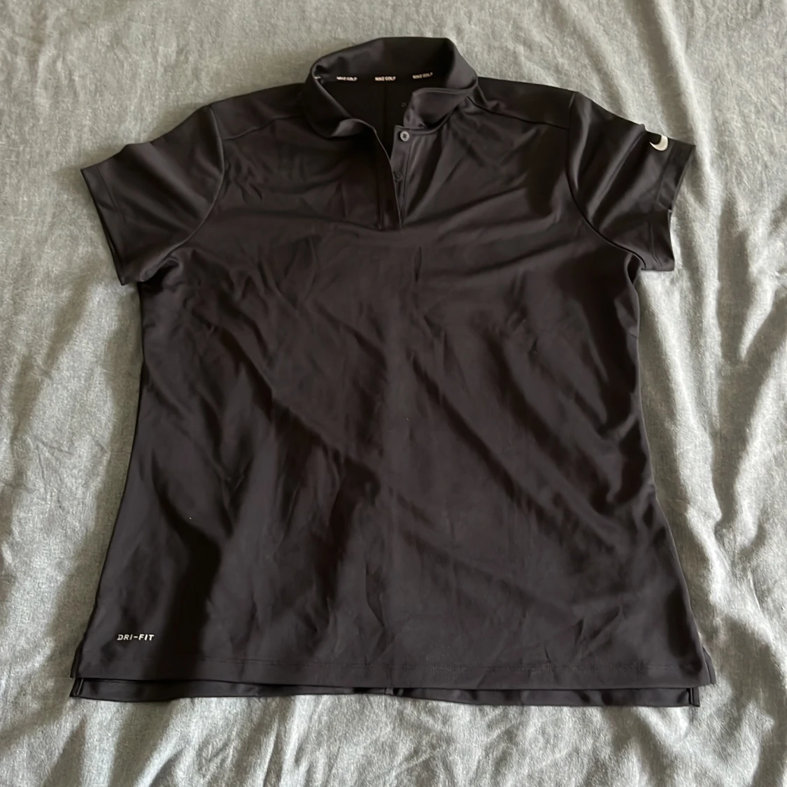 Svart Nike Golf Dri-Fit t-shirt i funktionsmaterial med korta ärmar och krage. Snyggt diskret Nike-logga på ärmen och klassisk knappslå framtill. Perfekt för golf eller andra sportiga aktiviteter. Materialet är lätt och andas, vilket gör den skön att bära. Sitter lite mindre än en XL
