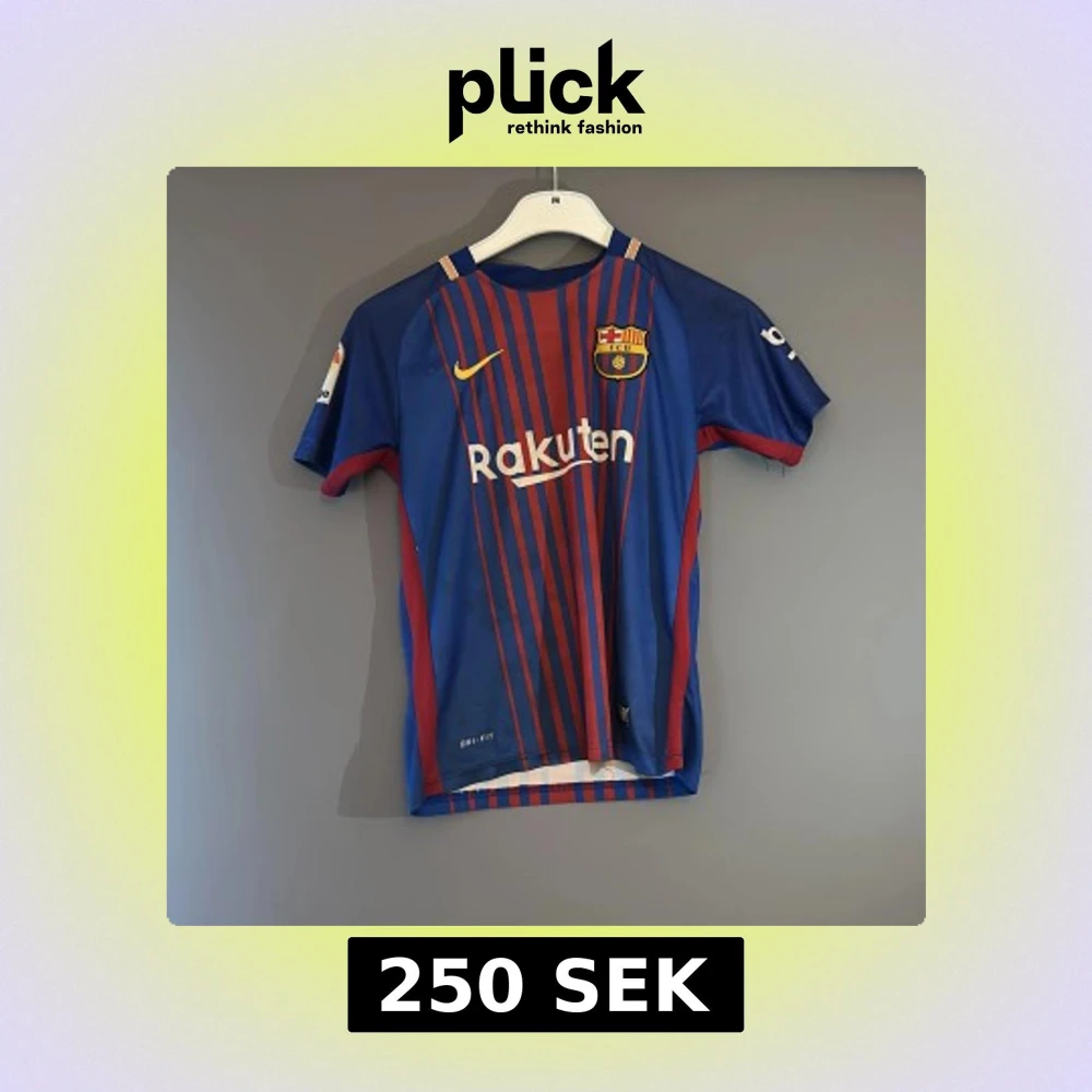 Säljer en äkta FC Barcelona matchtröja med Messi . Tröjan är blå med röda ränder, har korta ärmar och är tillverkad i lätt Dri-FIT-material. , klubbmärke och sponsorer på bröstet. Perfekt för dig som älskar fotboll och Messi!