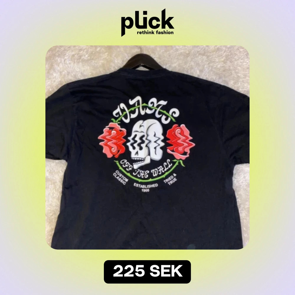 Säljer en svart t-shirt från Vans med coolt tryck av en dödskalle och rosor på baksidan. Framsidan har en mindre version av samma tryck med texten 'Off The Wall'. Väldigt bra skick👌🏽