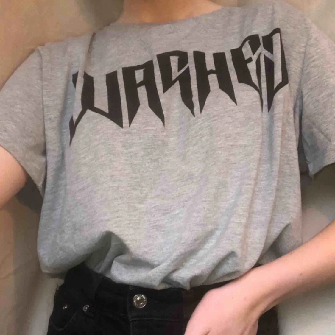 Grå oversized t-shirt med svart text över bröstet i storlek XS från lager157. Slutar strax nedanför rumpan och är supermysig! Knappt använd och är i nyskick, eventuell frakt tillkommer.