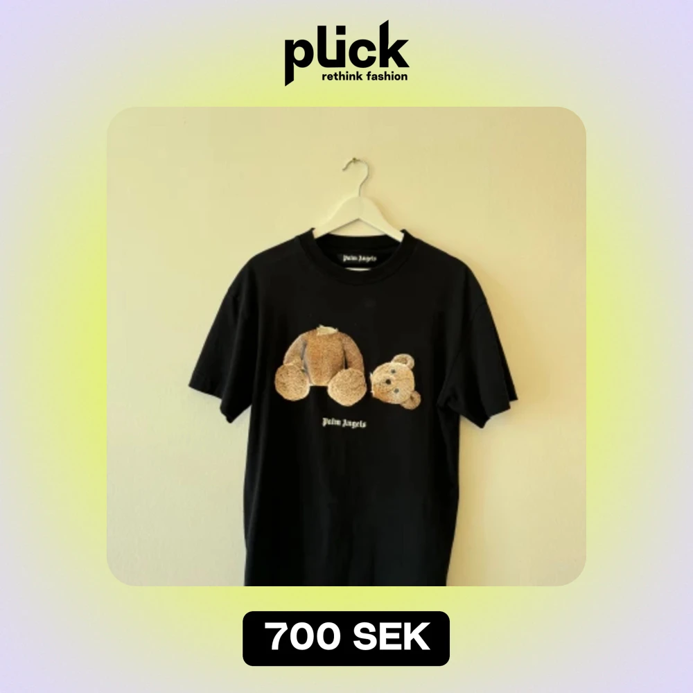Säljer en svart t-shirt från Palm Angels med ett coolt nallemotiv på framsidan. T-shirten har korta ärmar och är i bomull, vilket gör den superbekväm. Perfekt för en avslappnad stil!