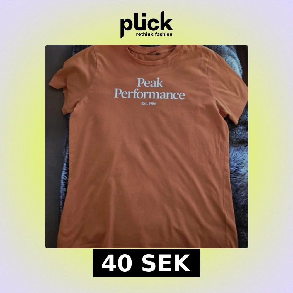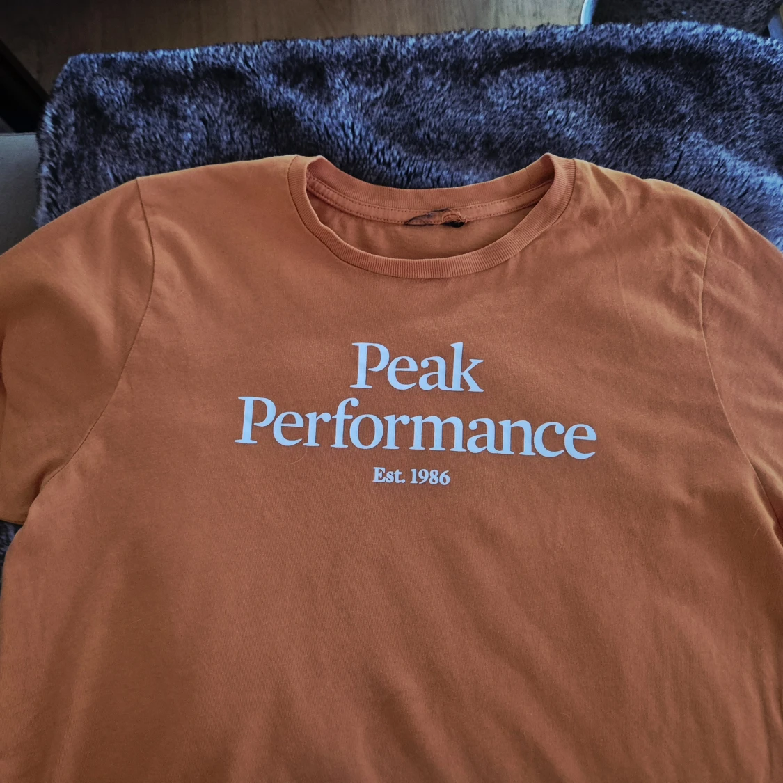 Snygg orange t-shirt från Peak Performance med vit logga och text 'Est. 1986' på bröstet. Klassisk rund halsringning och korta ärmar. Tillverkad i mjuk bomull för en skön känsla. Perfekt för en avslappnad och sportig stil. Finns ett litet hål baktill intill sömmen där storlek etiketten satt går lätt att laga