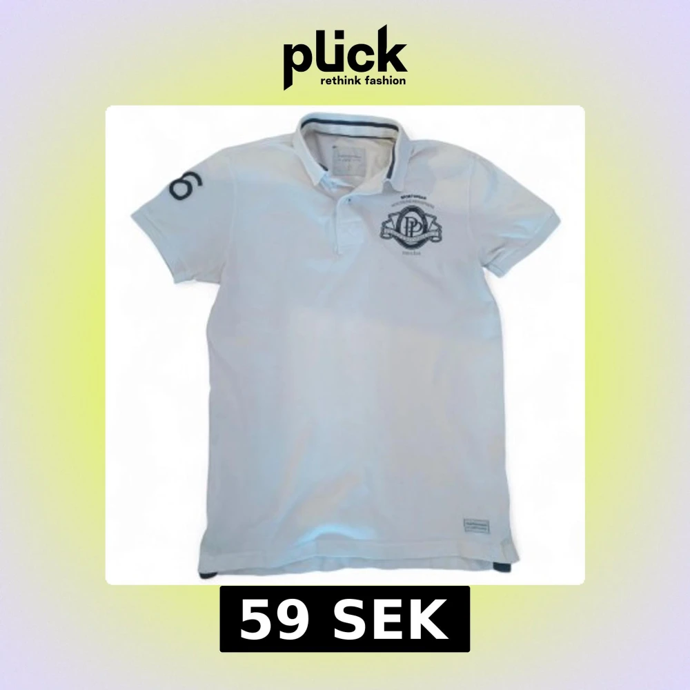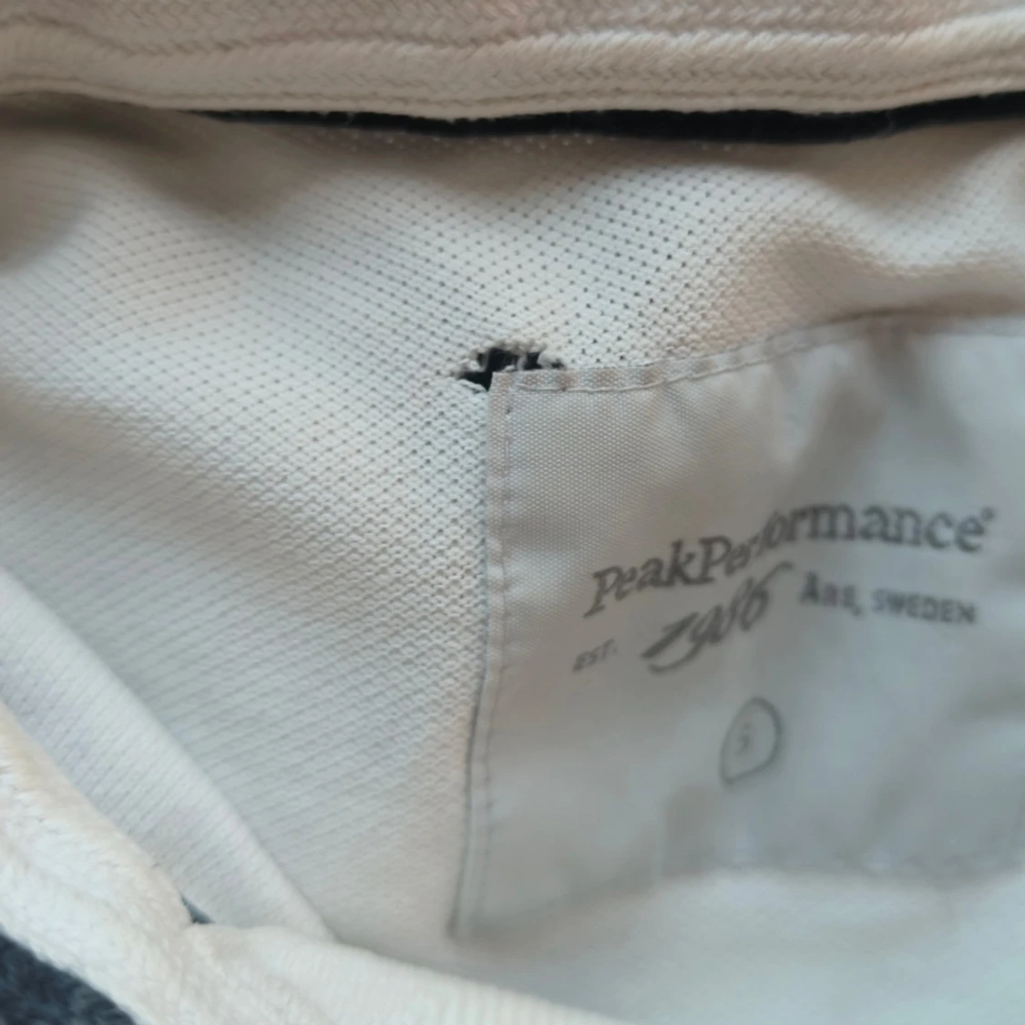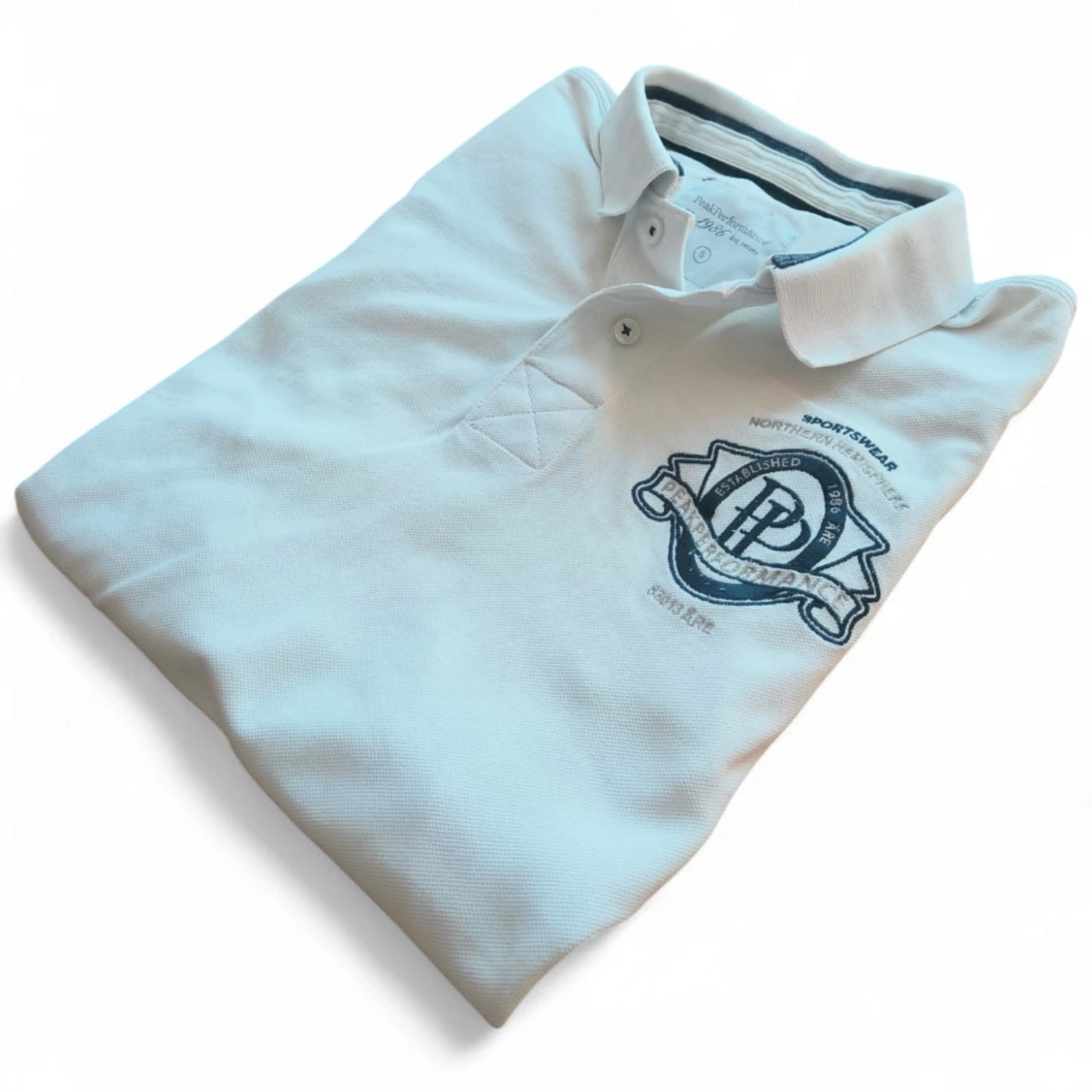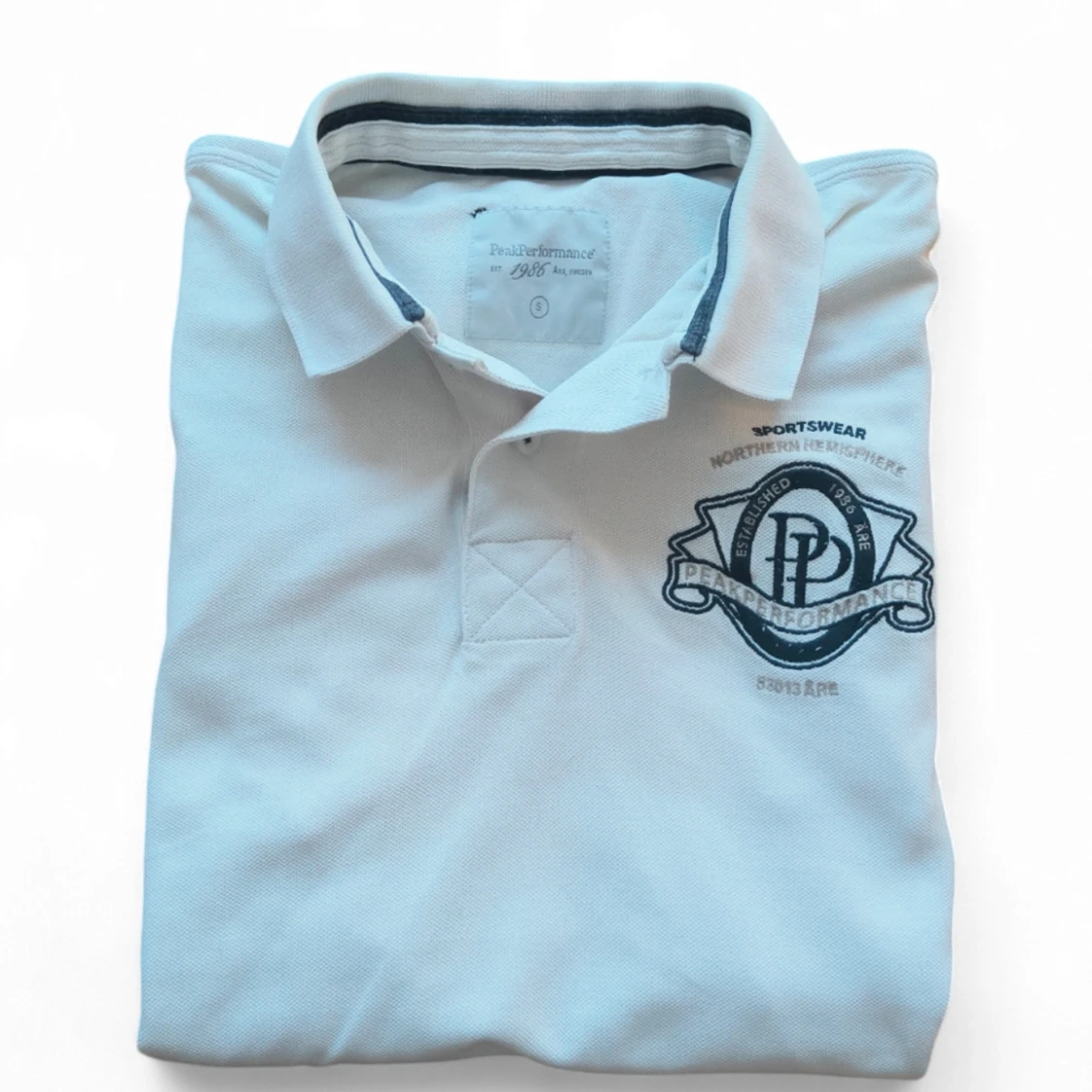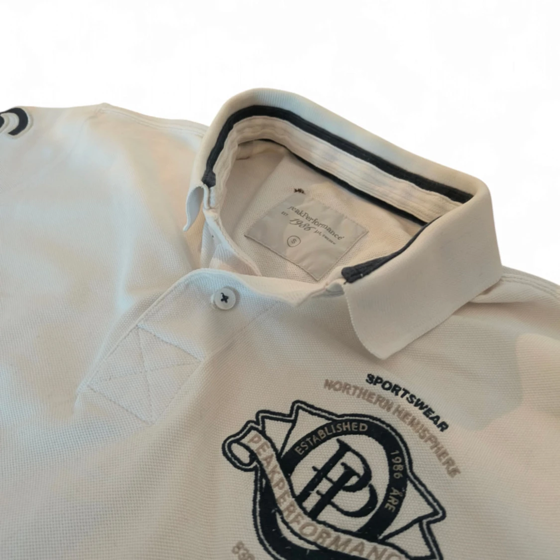 Snygg vit pikétröja från Peak Performance med broderad logga på bröstet och nummerdetalj på ärmen. Tröjan har en klassisk krage med knappar och är perfekt för en sportig look.