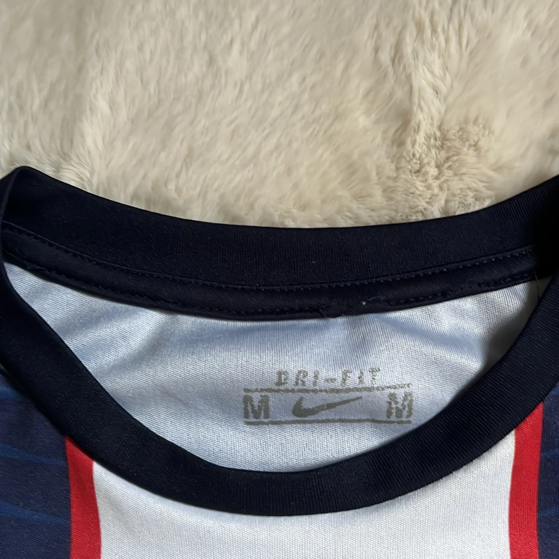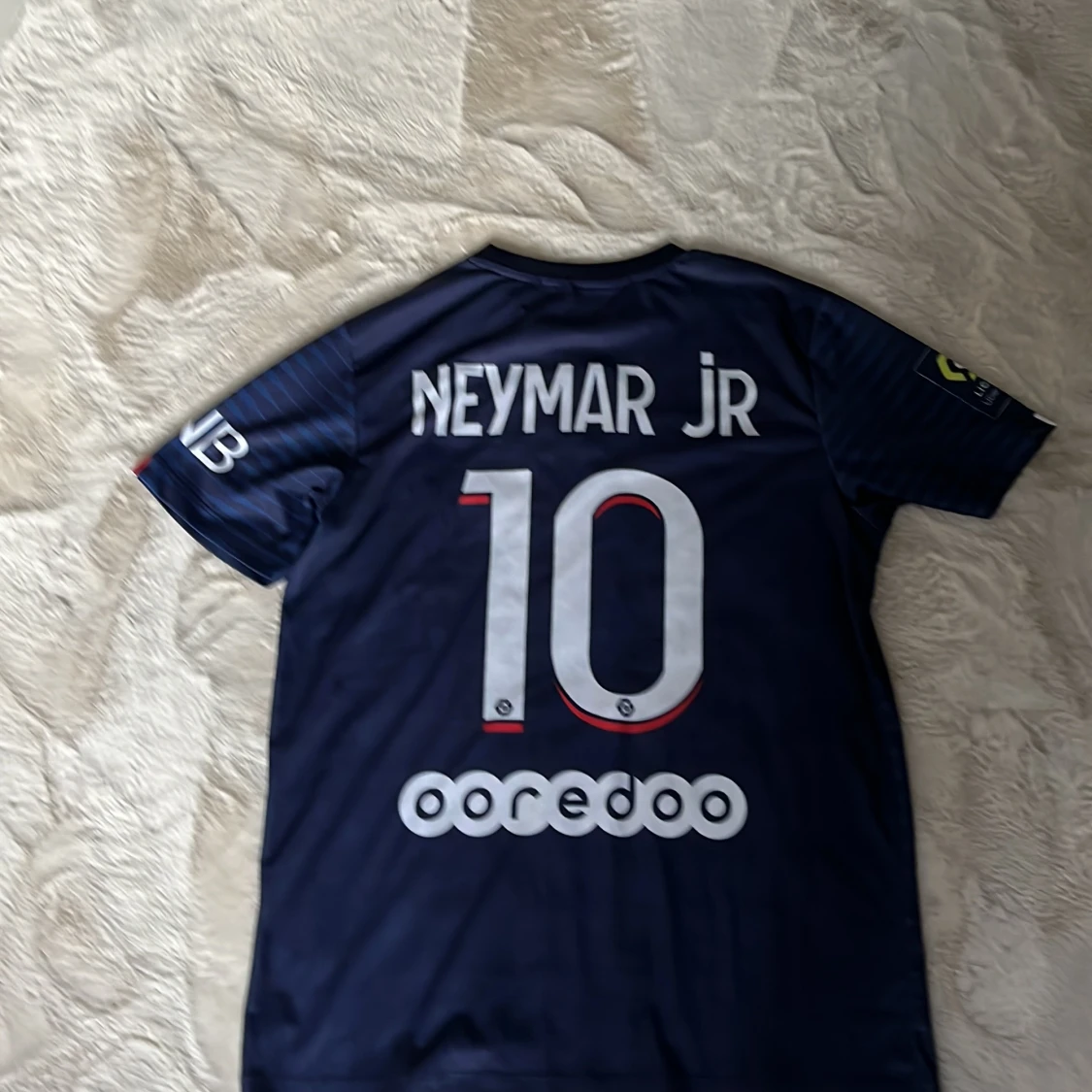 Snygg PSG fotbollströja med Neymar Jr och nummer 10 på ryggen. Tröjan är marinblå med vita och röda detaljer, har korta ärmar och är tillverkad i lätt Dri-Fit material. Framsidan har PSG-logga, sponsortryck och klassiska ränder. Perfekt för dig som älskar fotboll och Paris Saint-Germain.