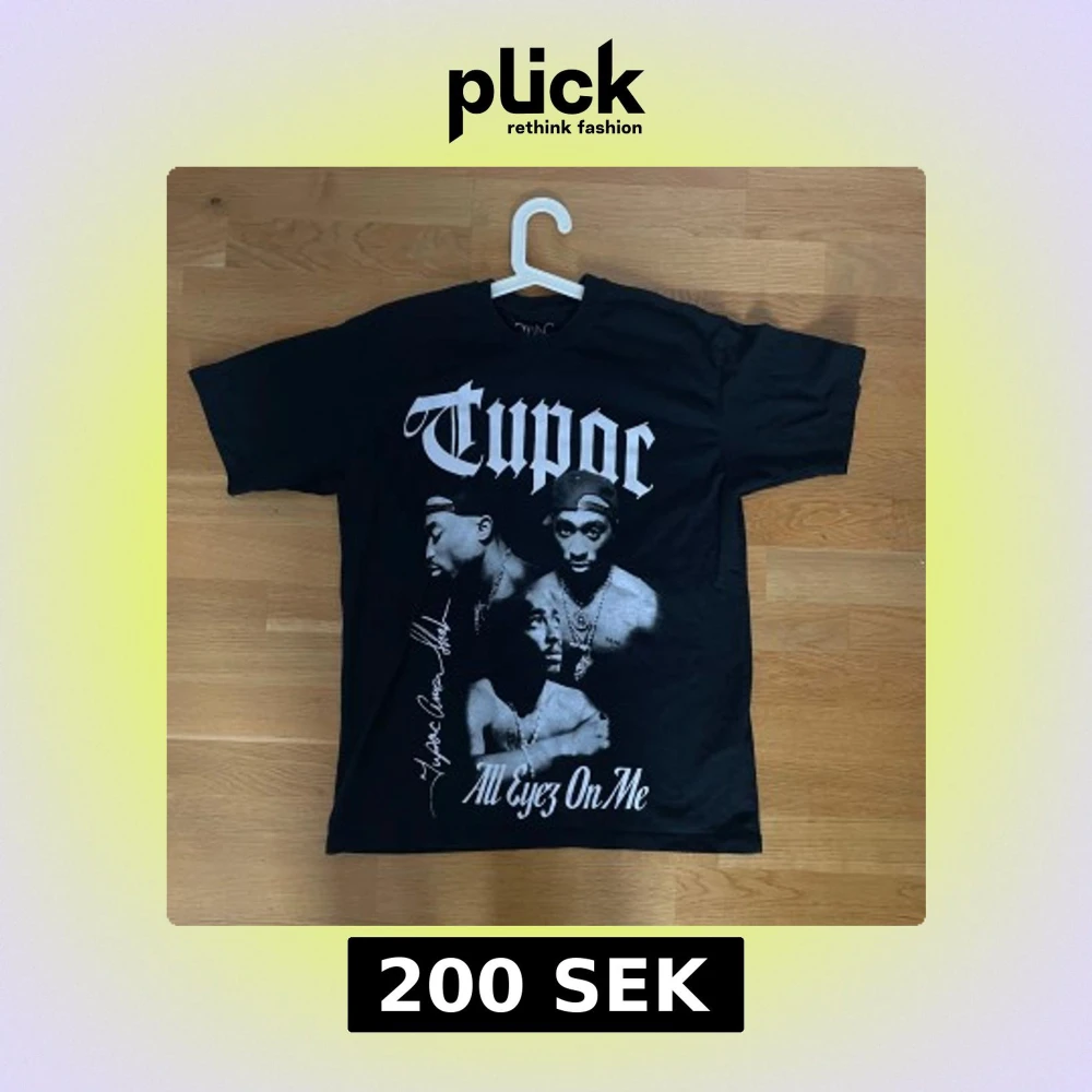 Svart t-shirt med stort Tupac-tryck och texten 'All Eyez On Me' framtill. Klassisk passform och rund halsringning. Perfekt för dig som gillar streetwear och hiphopstil.