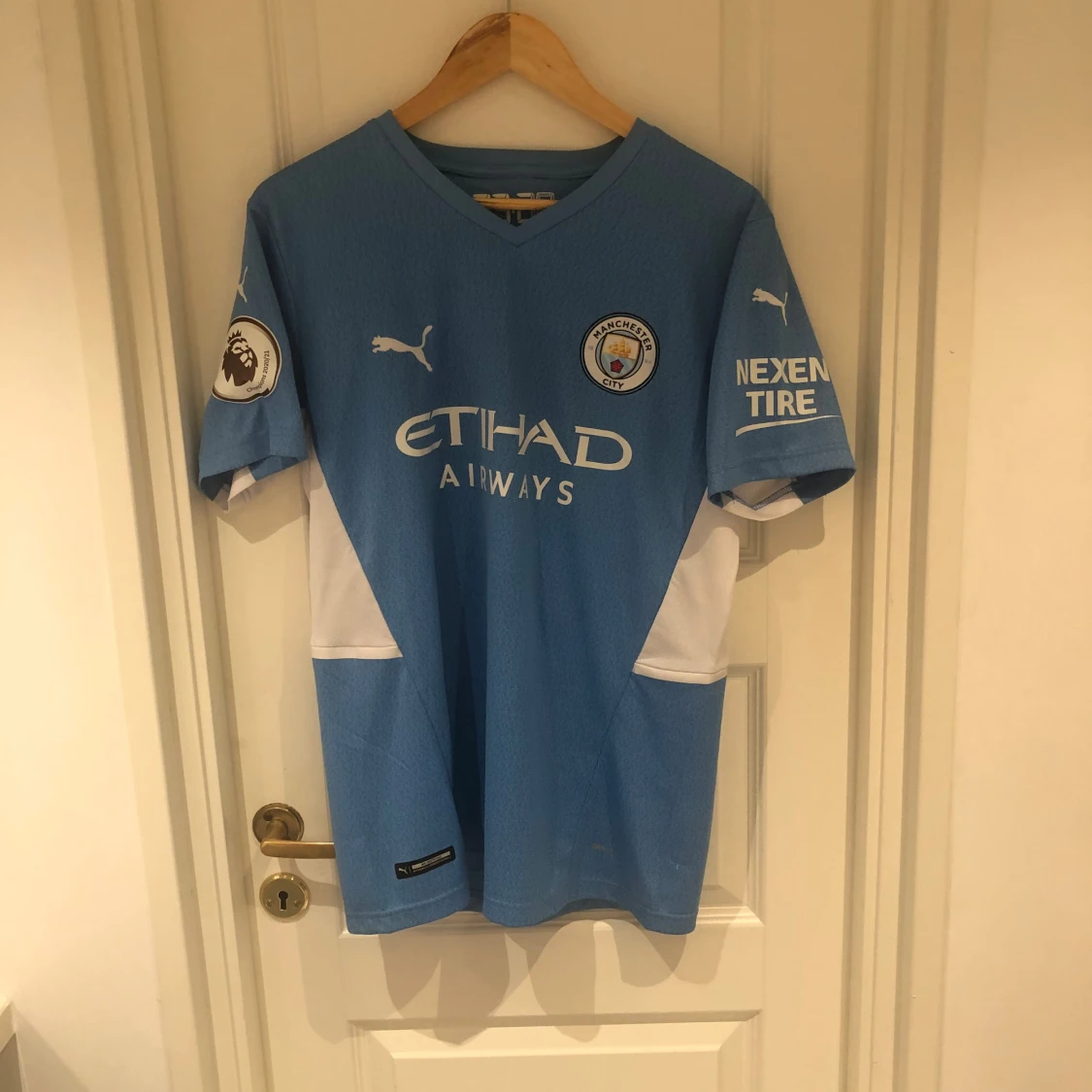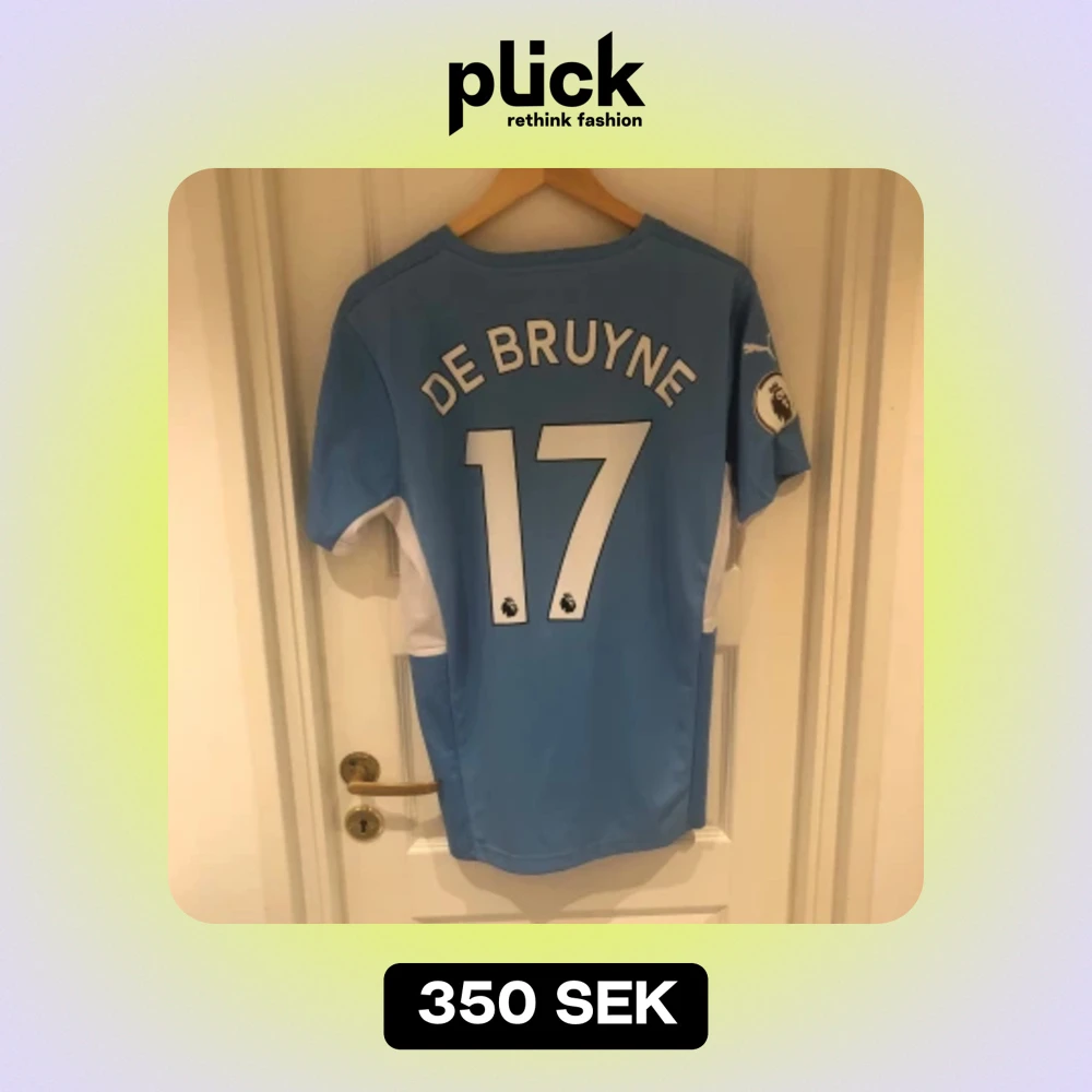 En blå Manchester City fotbollströja från Puma med korta ärmar. Tröjan har 'De Bruyne' och nummer 17 tryckt på baksidan. På framsidan finns Manchester Citys klubbmärke, Puma-logotypen, och sponsorn 'Etihad Airways'. Tröjan har även Premier League-logotypen på ärmen.