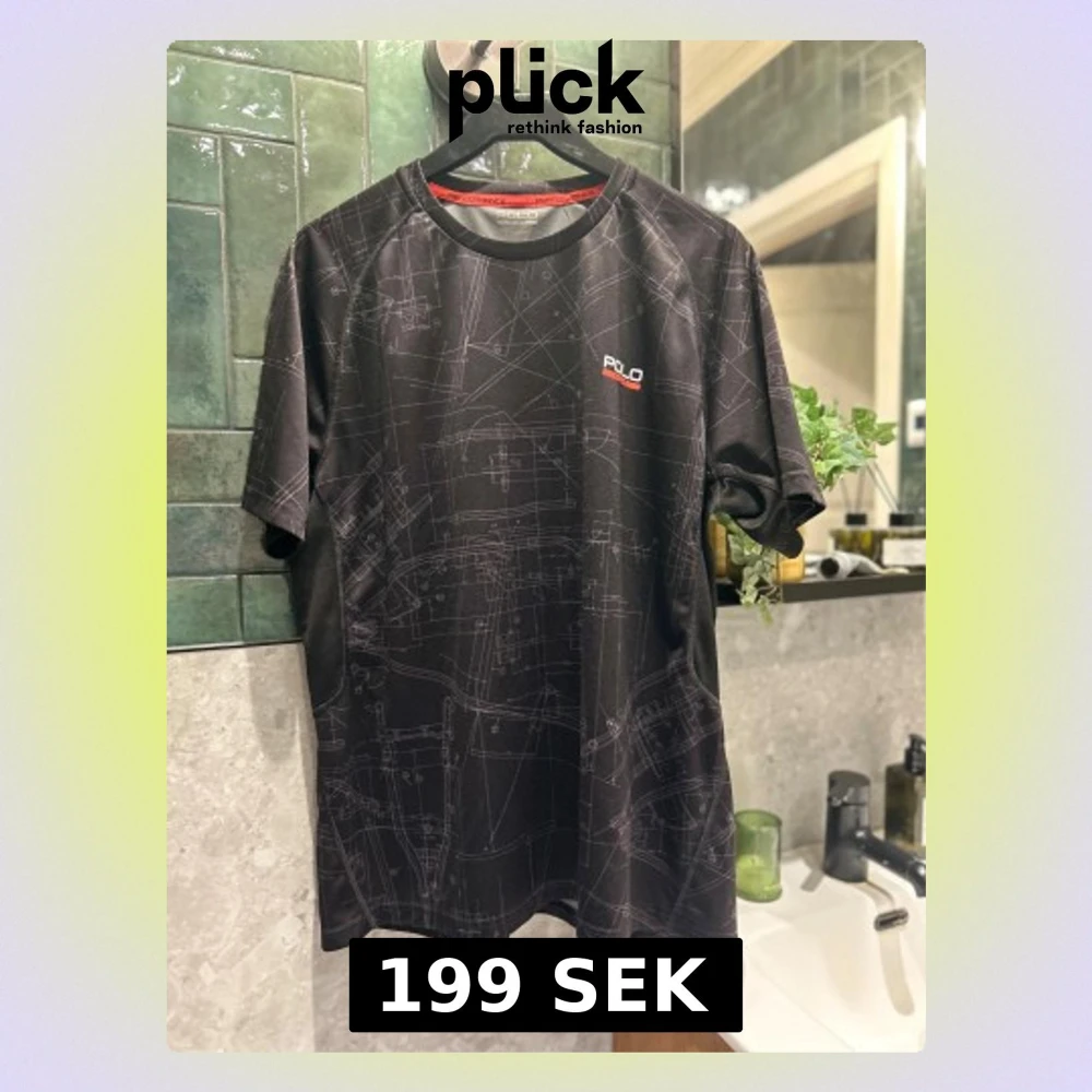 Svart t-shirt från Polo Sport Performance med coolt tekniskt mönster i grått. T-shirten har rund hals, korta ärmar och är gjord i ett lätt och sportigt polyestermaterial. Perfekt för dig som gillar en sportig och modern stil.