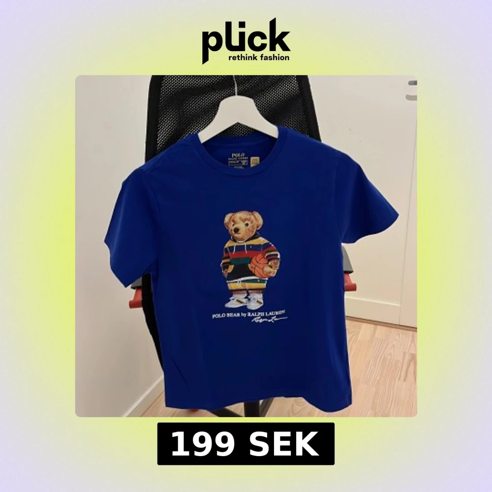 Säljer en blå t-shirt från Polo Ralph Lauren med ett coolt björntryck på framsidan. Björnen har en randig tröja och håller en basketboll. Perfekt för en avslappnad stil. T-shirten är kortärmad och gjord i bomull.