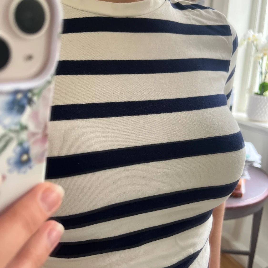 Superfin seglartopp från ZARA! Det är marinblå ränder, inte svarta. Den är insydd ( syns ej ) så den sitter tight🫶🏻