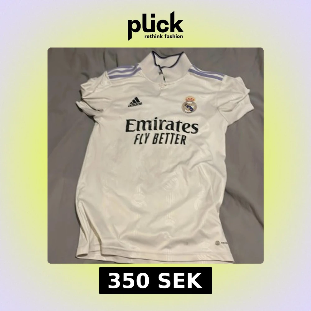 Säljer en vit Real Madrid fotbollströja från Adidas med korta ärmar och klubbens emblem på bröstet. Perfekt för alla fotbollsfans