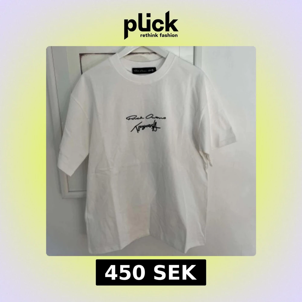 Säljer denna snygga vita t-shirt från Rick Owens med svart tryckt text framtill och större tryck på ryggen. Perfekt för en stilren och trendig look.
