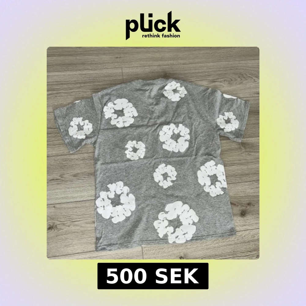 Snygg grå t-shirt från Denim Tears med stora vita blommor tryckta över hela plagget. Klassisk passform med korta ärmar och rund hals. Tillverkad i mjuk bomull som känns skön mot huden. Perfekt för dig som vill sticka ut med en unik och trendig look.