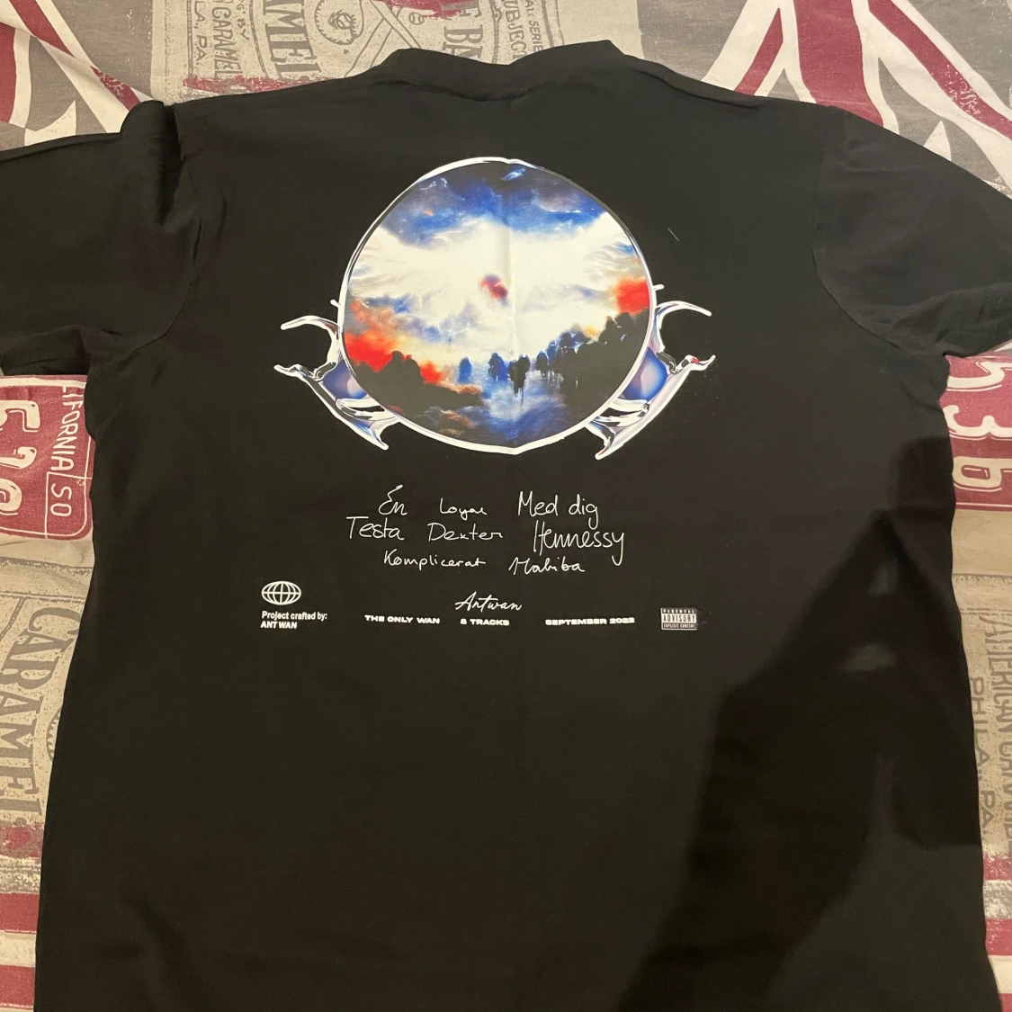 Antwan merch, Svart t-shirt med vit grafisk text på framsidan och stor färgglad print på ryggen med motiv och handskriven text. Från september 2021. Skön passform och cool design för dig som gillar streetwear. Aldrig använd, passar både tjejer och killar.