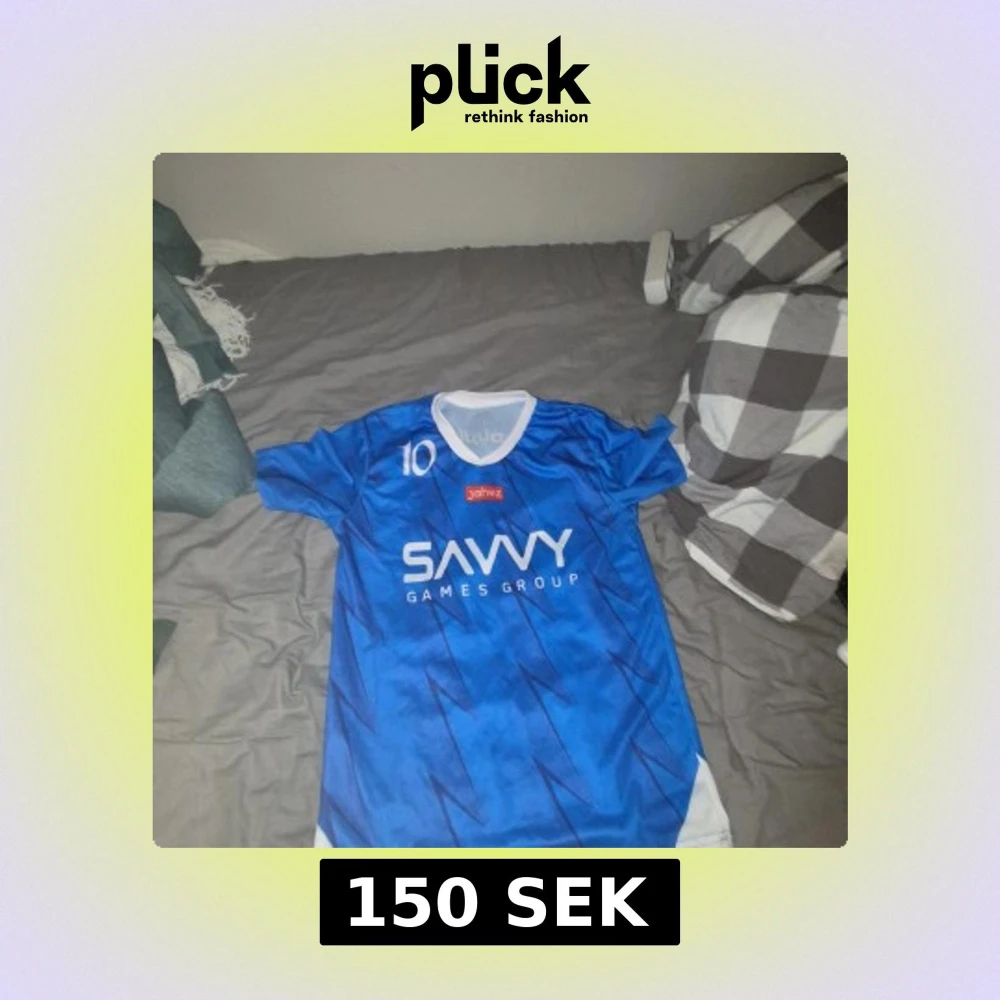 Säljer en blå fotbollströja med nummer 10 och Neymar Jr på ryggen. Tröjan har korta ärmar, vit krage och vita detaljer på sidorna. Framsidan har tryck från Savvy Games Group och Jahez, medan baksidan har Seven-logga och arabisk text. Materialet är lätt och andas, perfekt för match eller träning.