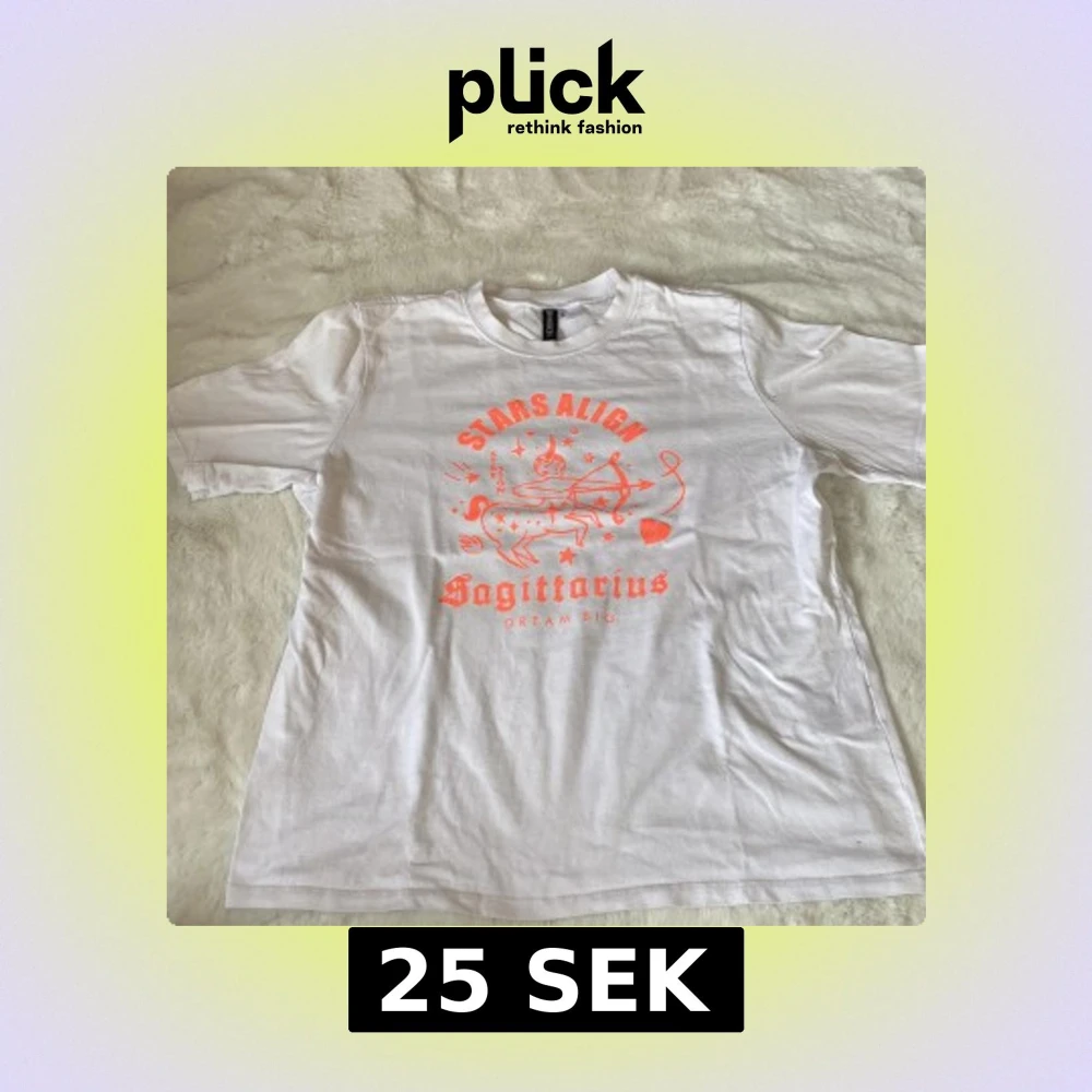 Säljer en vit t-shirt från H&M Divided med ett coolt orange tryck av stjärntecknet Skytten och texten 'Stars Align Sagittarius Dream Big'. Perfekt för astrologiälskare!