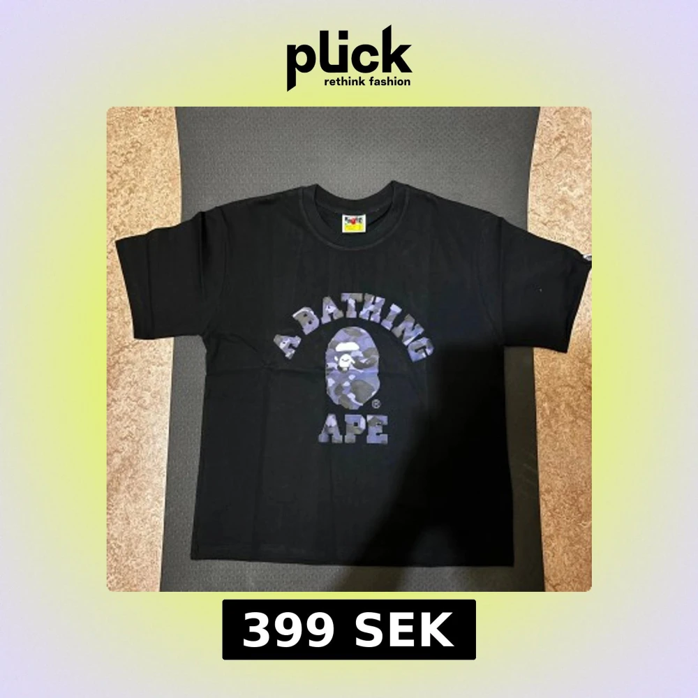 Svart t-shirt från BAPE med klassiskt camo-print i blå och lila toner på bröstet och stor logga 'A Bathing Ape'. Rund hals och korta ärmar. Ikonisk BAPE-tag på ärmen. Tillverkad i mjuk bomull, perfekt för streetwear.