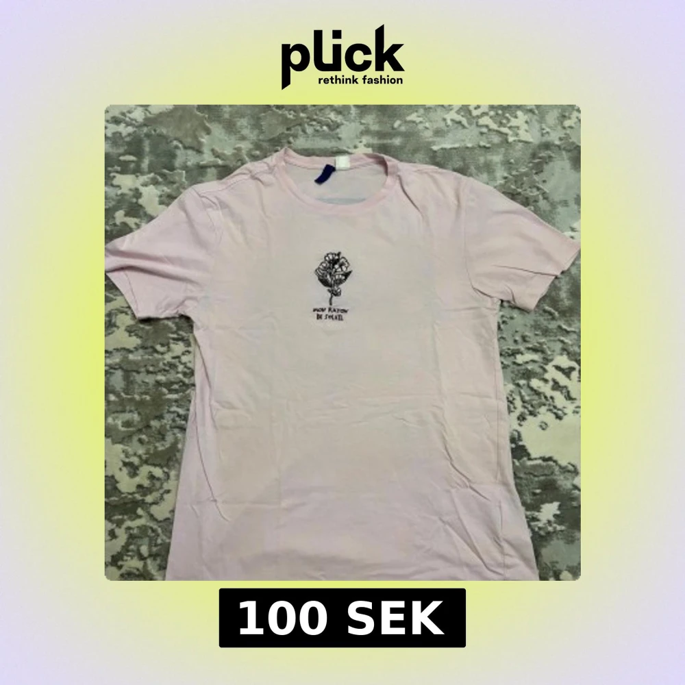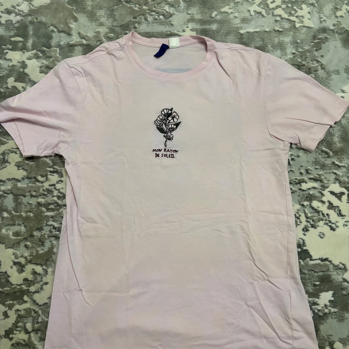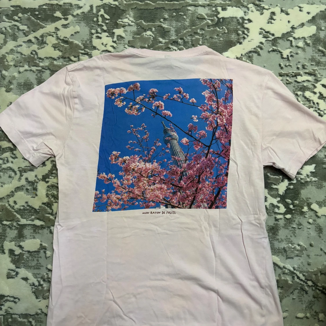 Ljusrosa t-shirt med korta ärmar och rund hals. Framsidan har ett broderat blommotiv och texten 'Mon Rayon De Soleil'. Baksidan har ett stort tryck med körsbärsblommor och blå himmel. Skön och mjuk bomull, perfekt för en chill look.