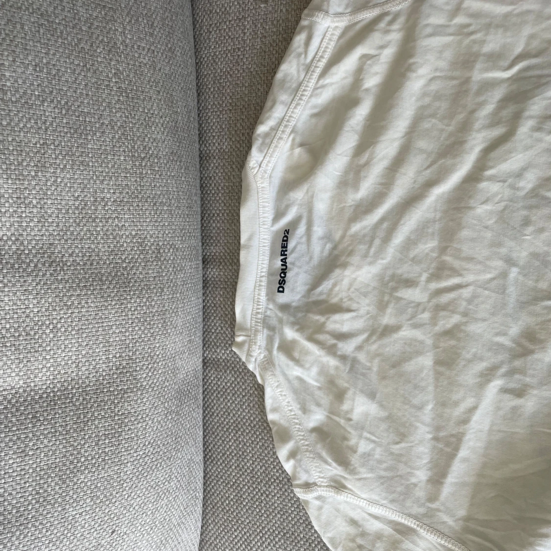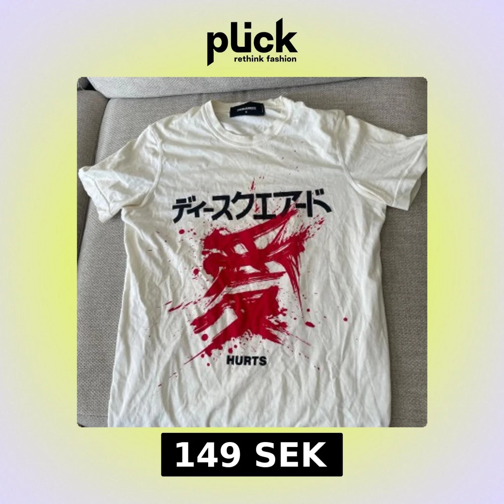 Säljer en cool vit t-shirt från Dsquared2 med ett iögonfallande rött tryck och japansk text på framsidan. Perfekt för dig som vill sticka ut med en unik stil. T-shirten har korta ärmar och är gjord i mjukt bomullsmaterial. Lite skavanker som syns på bilder.