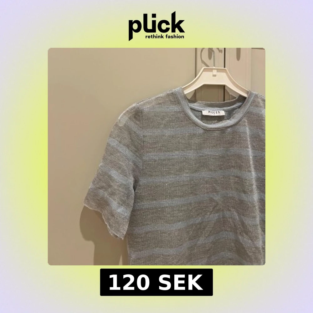 Säljer en snygg grå t-shirt från Pieces med glittriga ränder. T-shirten har korta ärmar och en rund halsringning.