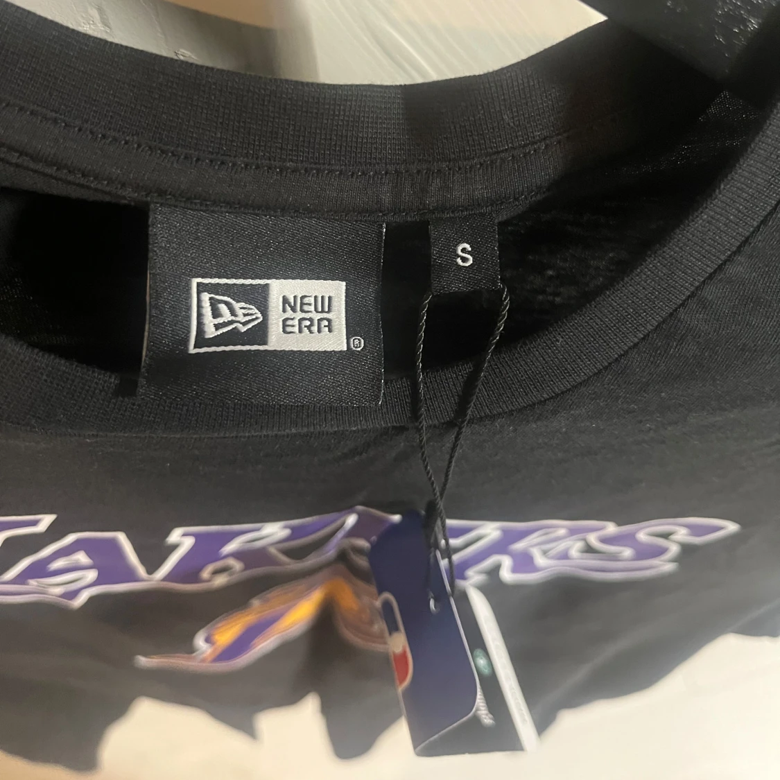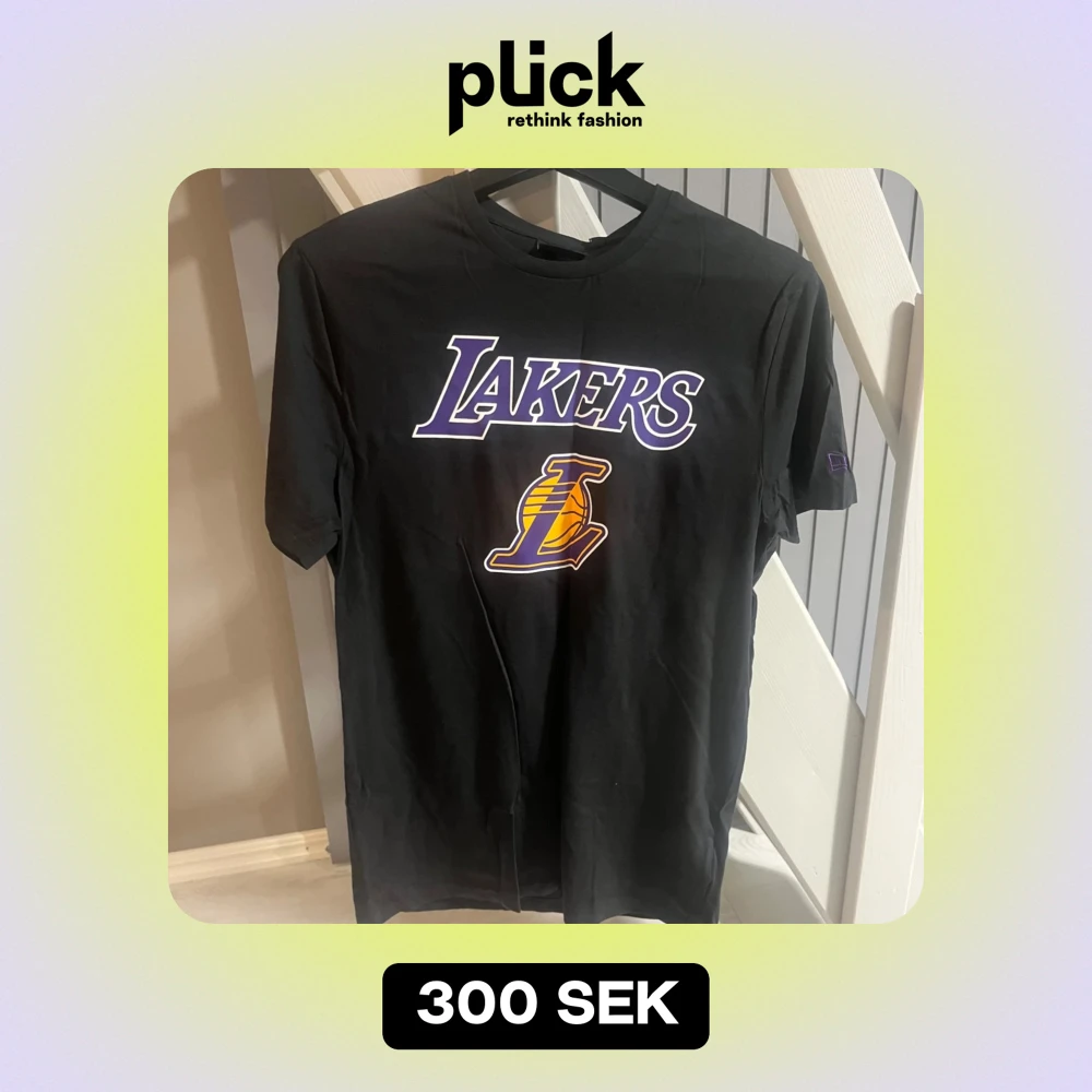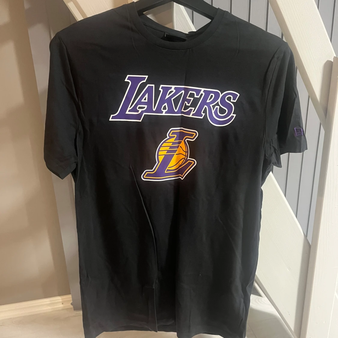 Snygg svart t-shirt från New Era med Lakers-logga i lila och gult på bröstet. Perfekt för basketfans som vill visa sitt stöd. T-shirten har en klassisk passform och korta ärmar.