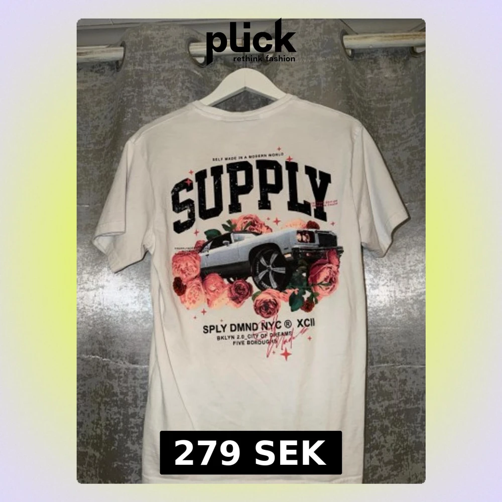 Säljer en vit t-shirt från Supply & Demand med stor SUPPLY-print på ryggen, motiv av en klassisk bil och rosa rosor. Framsidan har mindre tryck med samma motiv. Skön passform och cool streetstil, perfekt till jeans eller shorts. Passar Xs och S