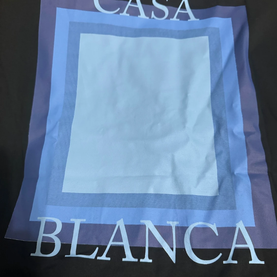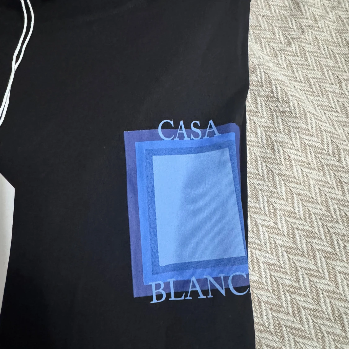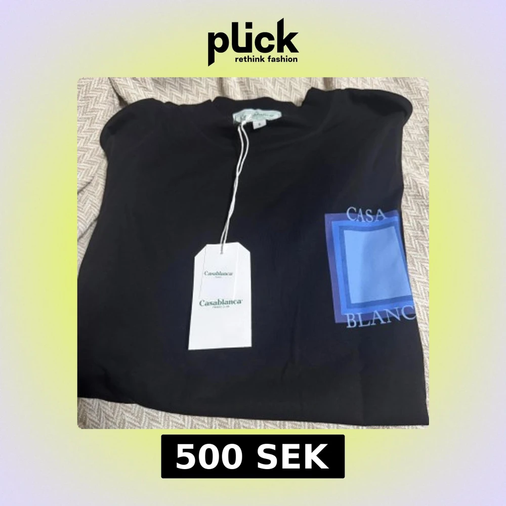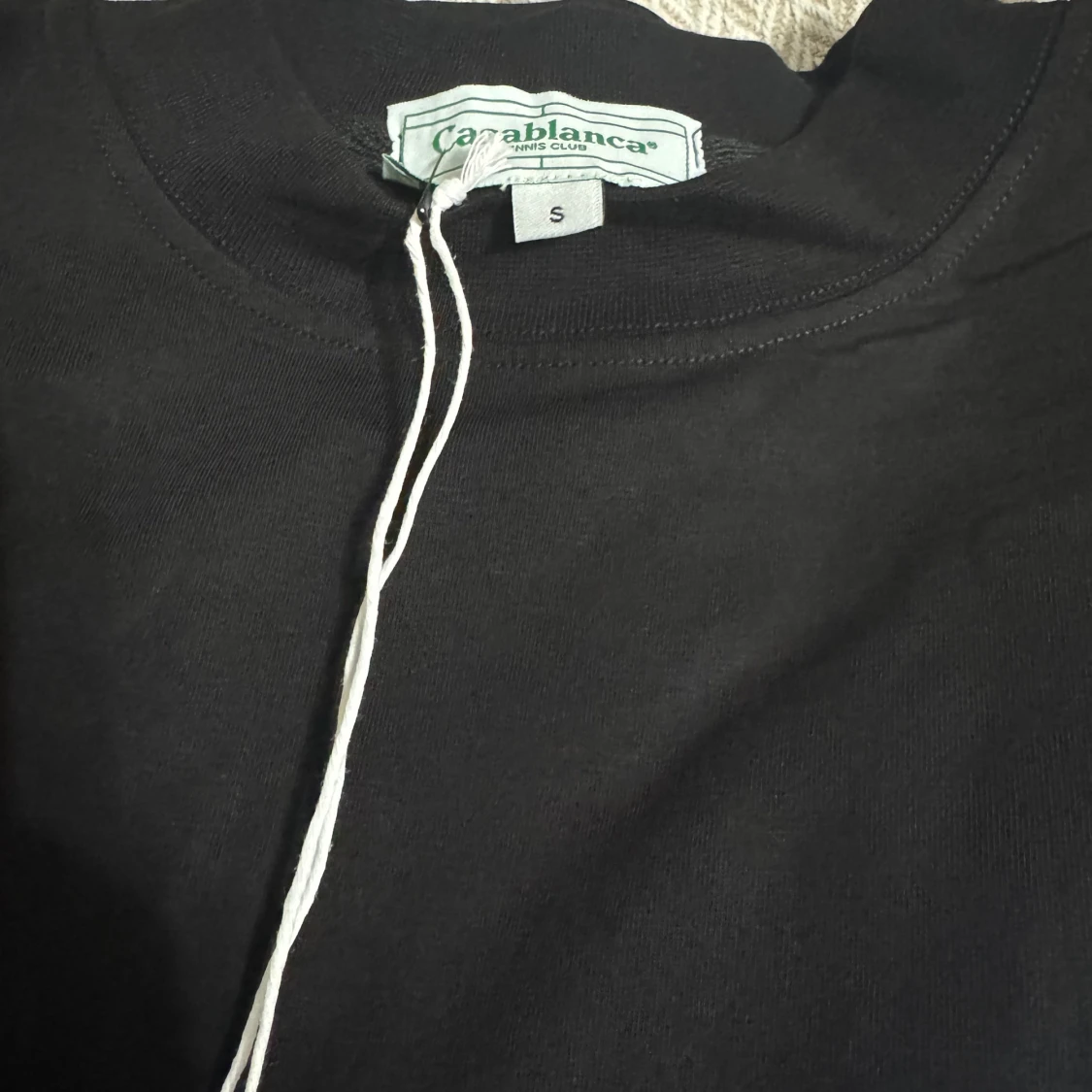 Svart t-shirt från Casablanca Tennis Club i storlek S. Framsidan har ett blått grafiskt tryck med texten 'CASABLANCA'. Klassisk rund hals och kort ärm. Tillverkad i mjuk bomull för en skön känsla. Perfekt för dig som gillar stilrena streetwear-plagg.