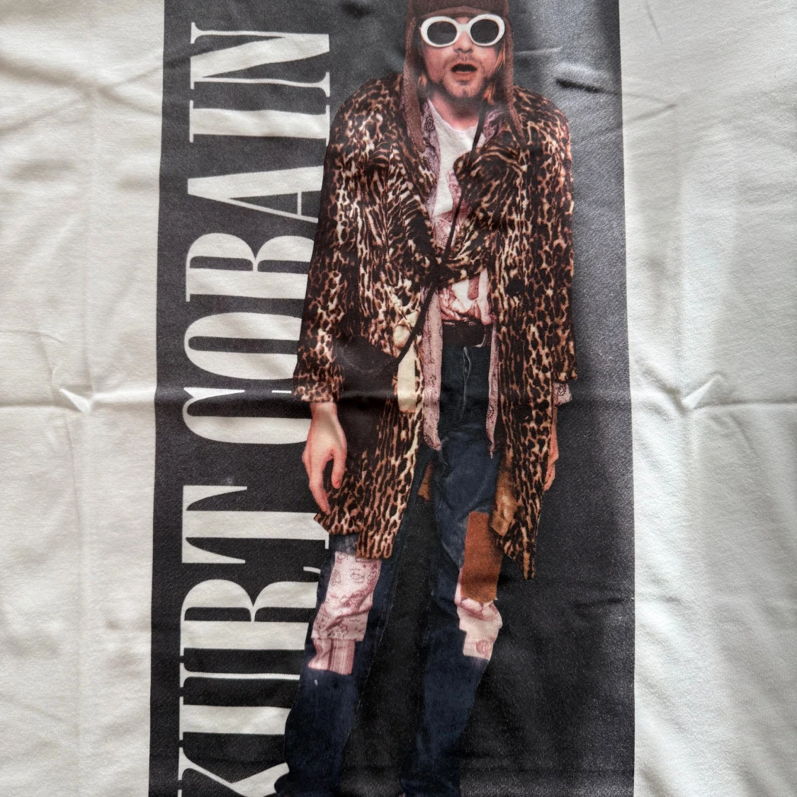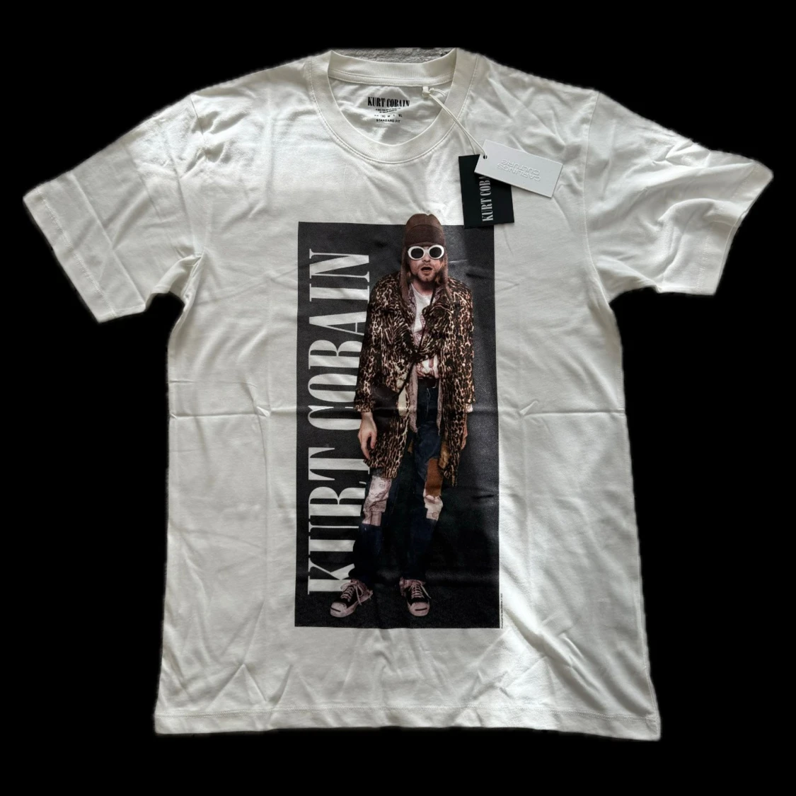 Vit t-shirt från Carlings Couture med stor tryckt bild på Kurt Cobain i leopardmönstrad jacka och texten 'KURT COBAIN' längs sidan. Klassisk rund hals och korta ärmar, tillverkad i mjuk bomull. Perfekt statement-plagg för dig som gillar musik och streetstyle.