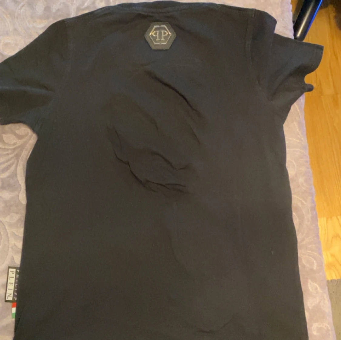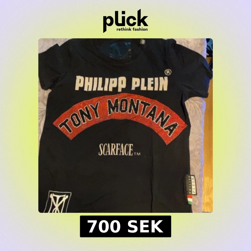 Svart t-shirt från Philipp Plein med coolt Scarface-tryck och Tony Montana-text i rött med glittriga detaljer. Rund hals, korta ärmar och logotyp på ryggen. Materialet känns som mjuk bomull och har en snygg passform. Perfekt för dig som gillar statement-plagg.