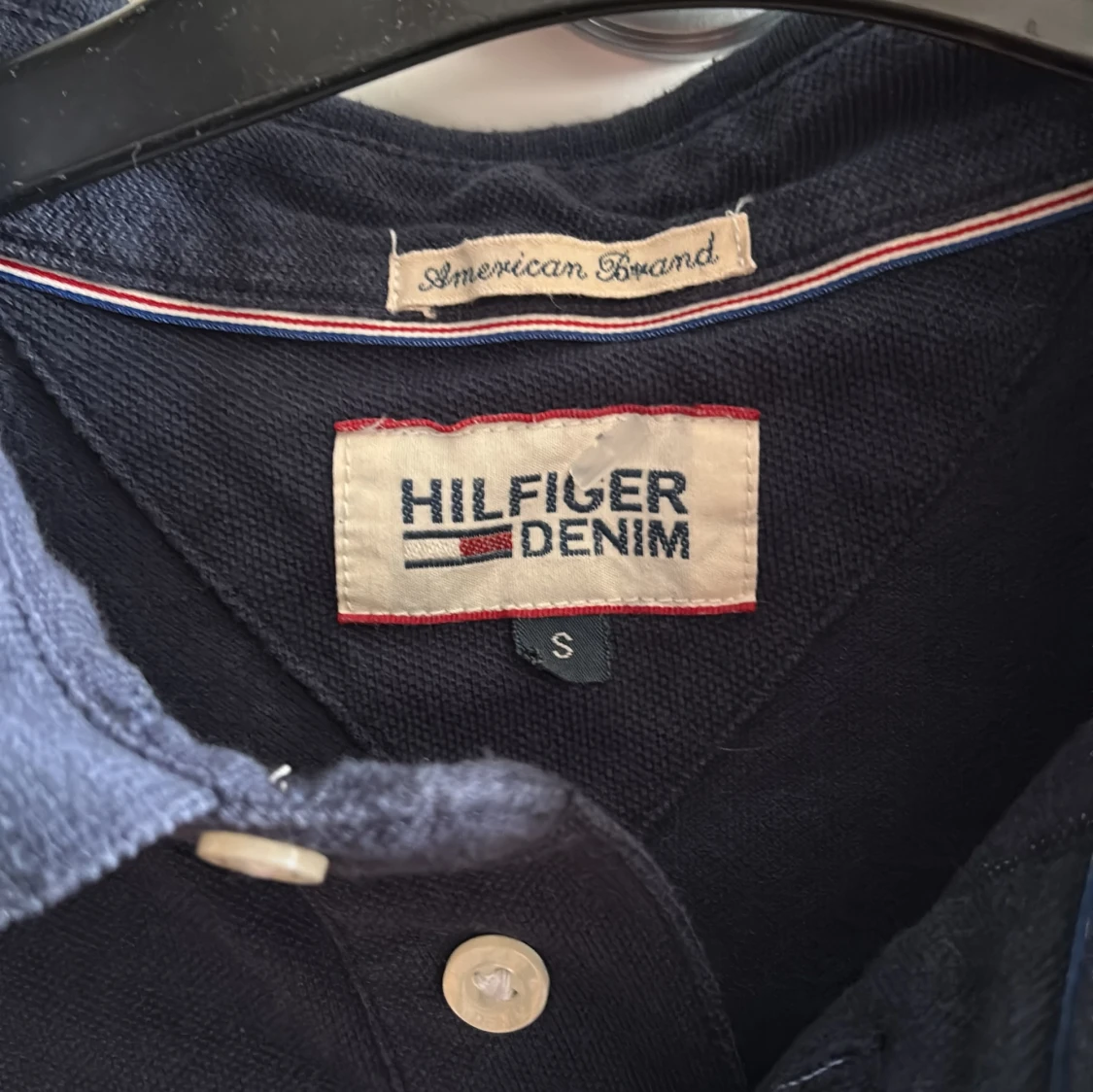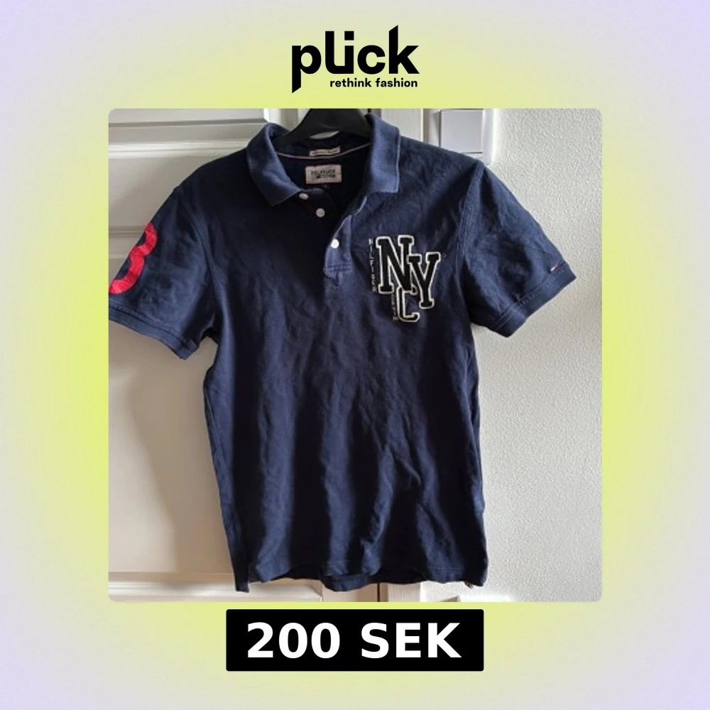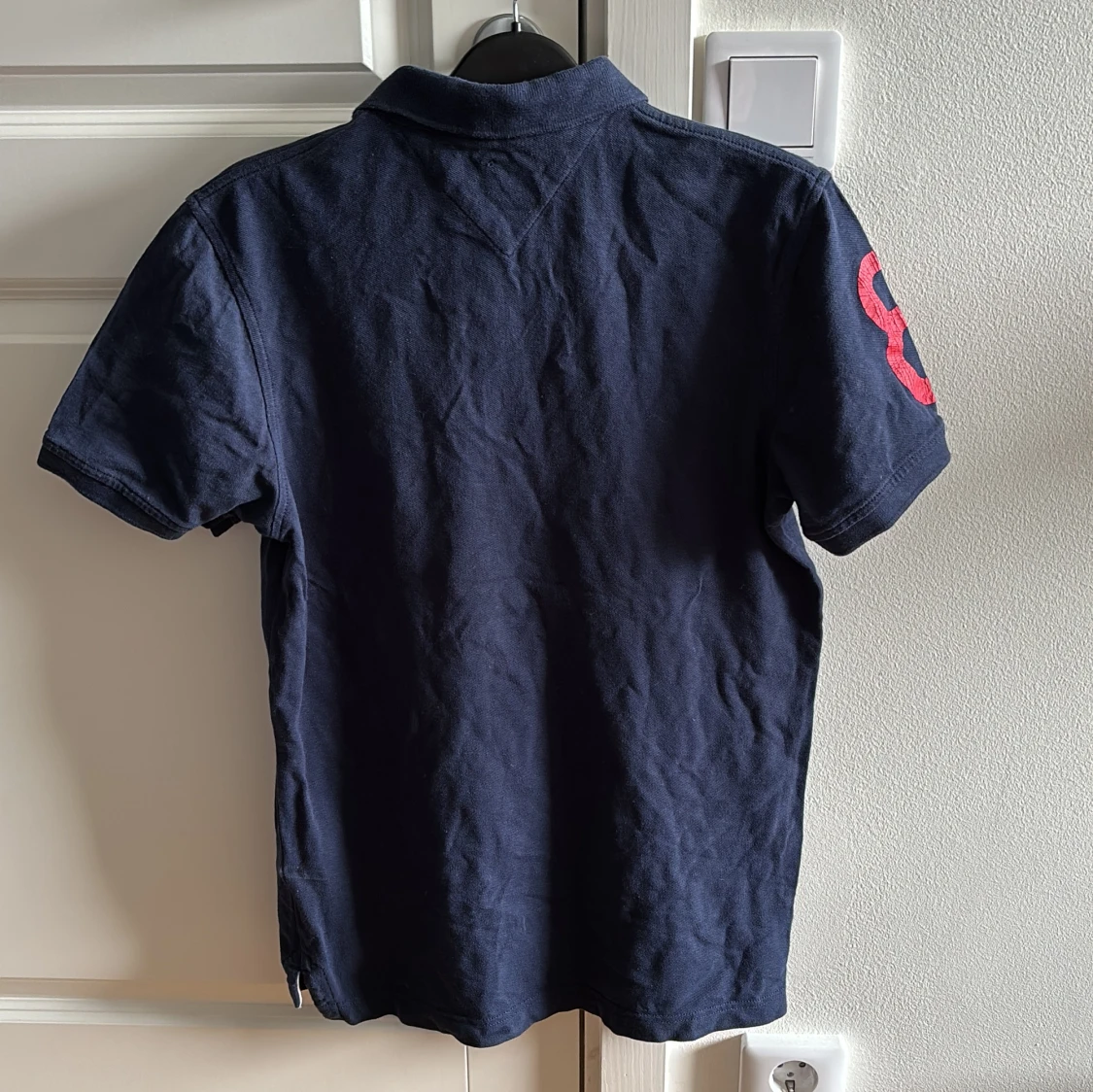 Säljer en mörkblå pikétröja från Hilfiger Denim med broderad NYC-logga på bröstet och röd siffra på ärmen. Klassisk krage och knäppning framtill. Perfekt för en avslappnad och stilren look.