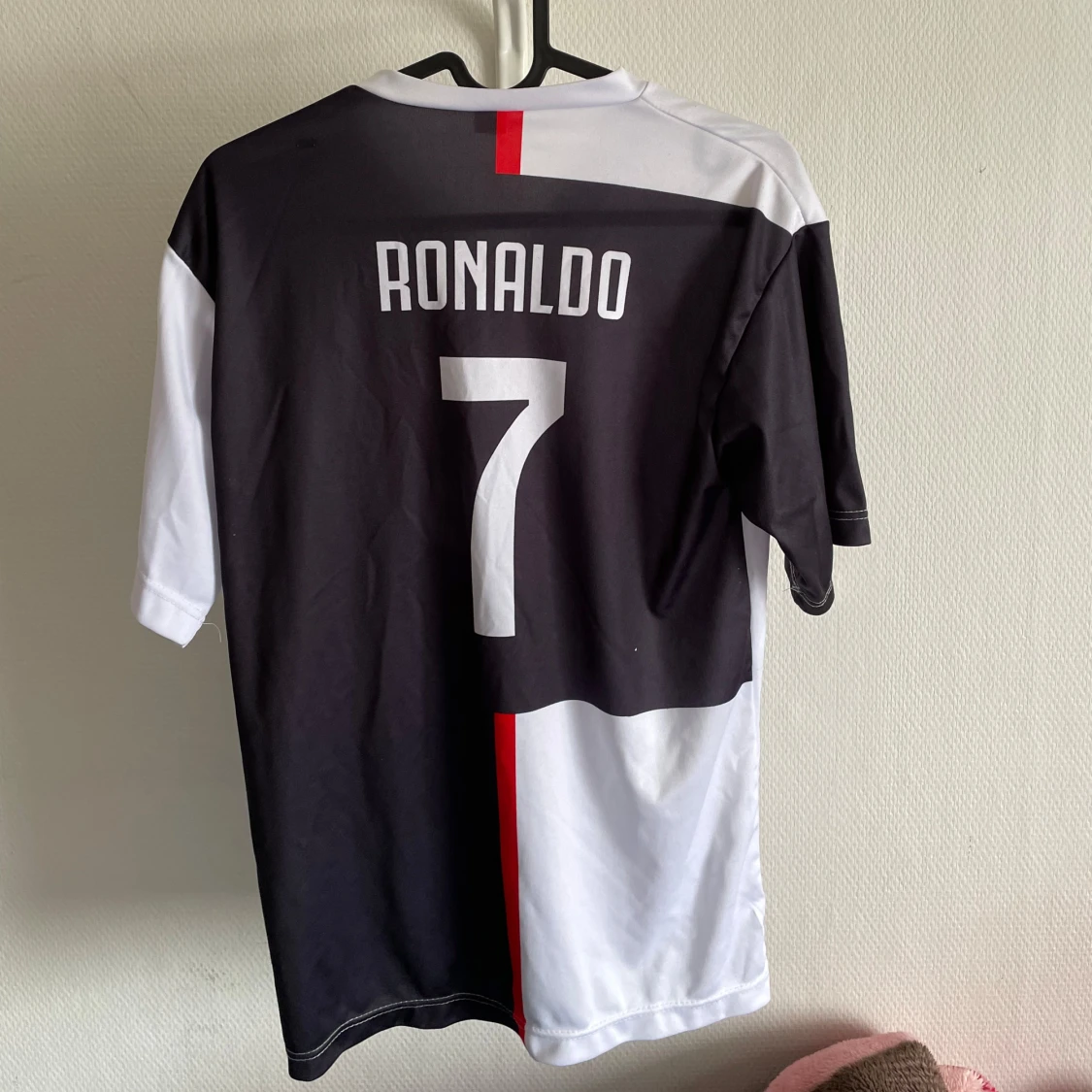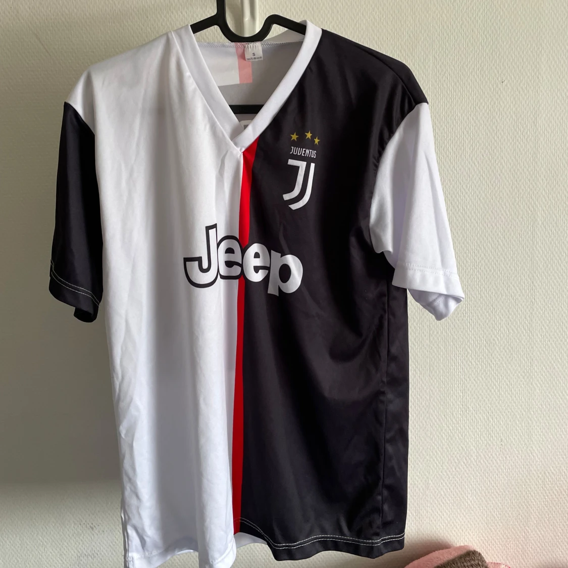 Juventus matchtröja med svart och vit design, röd rand i mitten och Jeep-logga på bröstet. Nummer 7 och Ronaldo på ryggen. Klassisk V-ringning och korta ärmar.