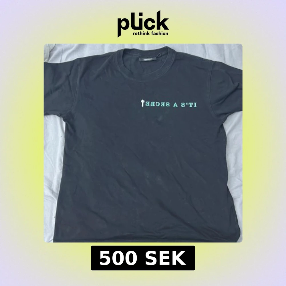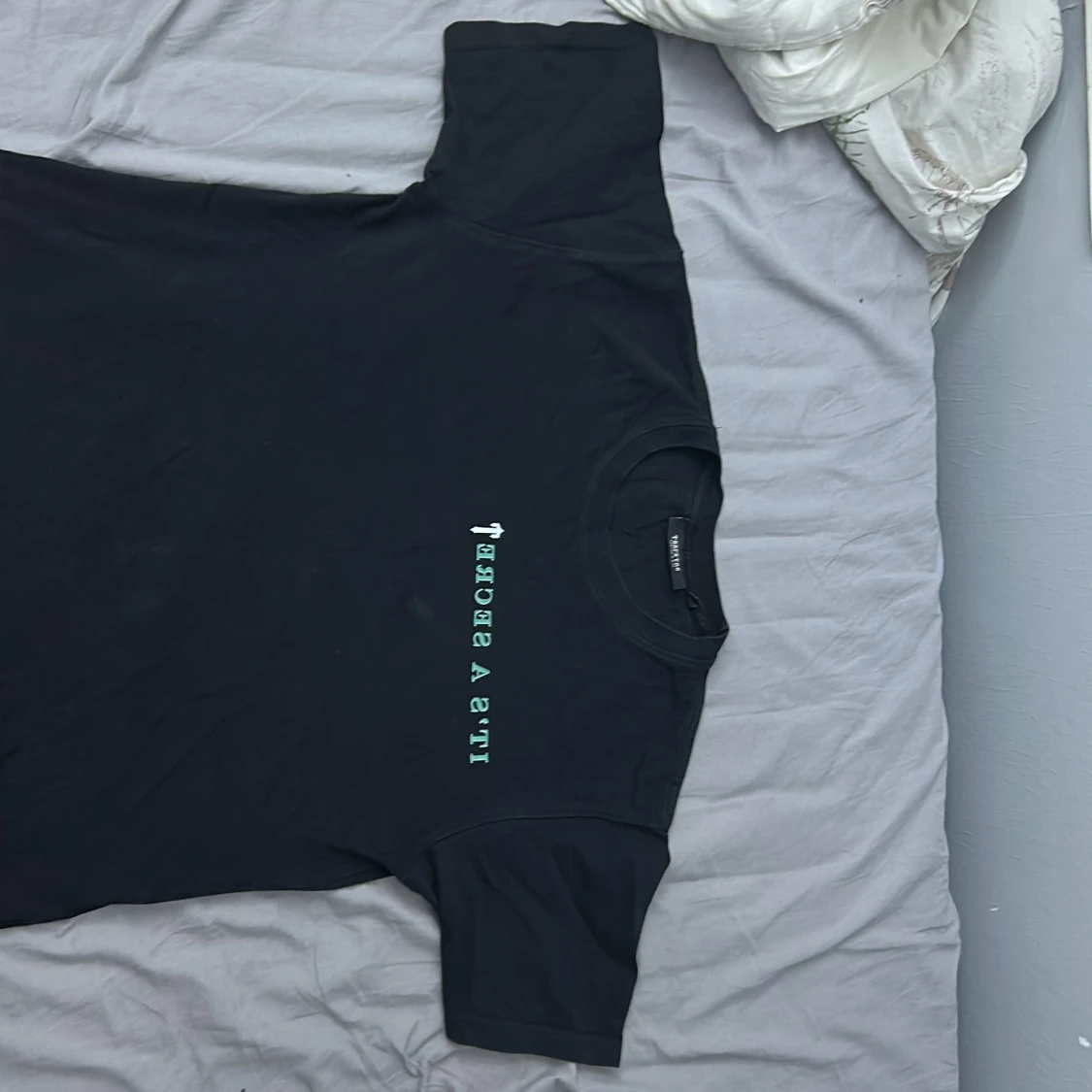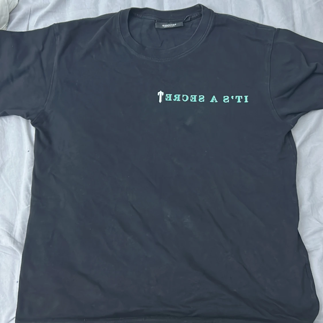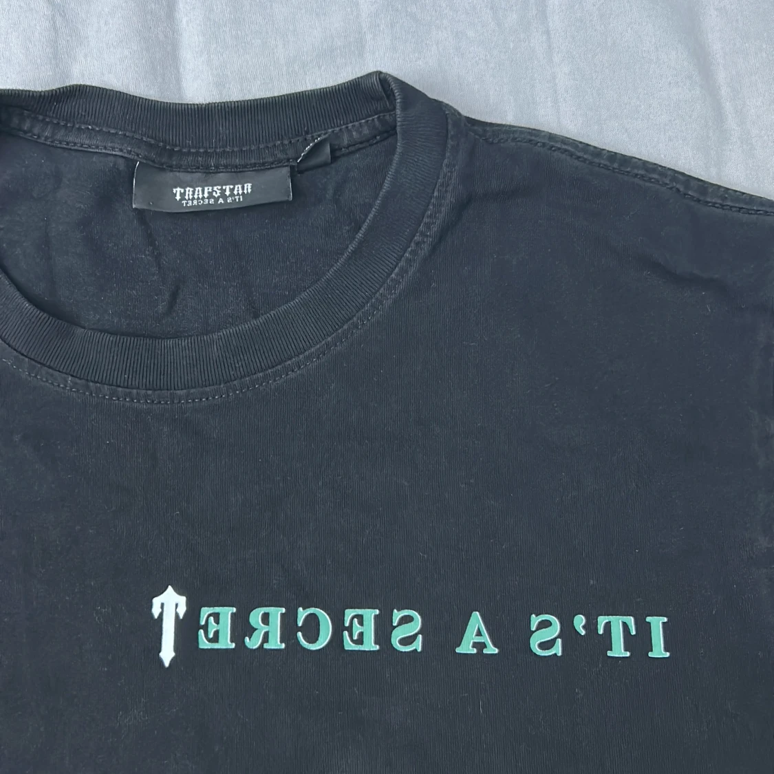 Svart t-shirt från Trapstar med coolt turkost tryck på bröstet och ryggen där det står 'IT'S A SECRET' och en pil. Klassisk rund hals och korta ärmar. Materialet är mjuk bomull som känns skönt mot huden. Perfekt för dig som gillar streetwear och vill sticka ut.