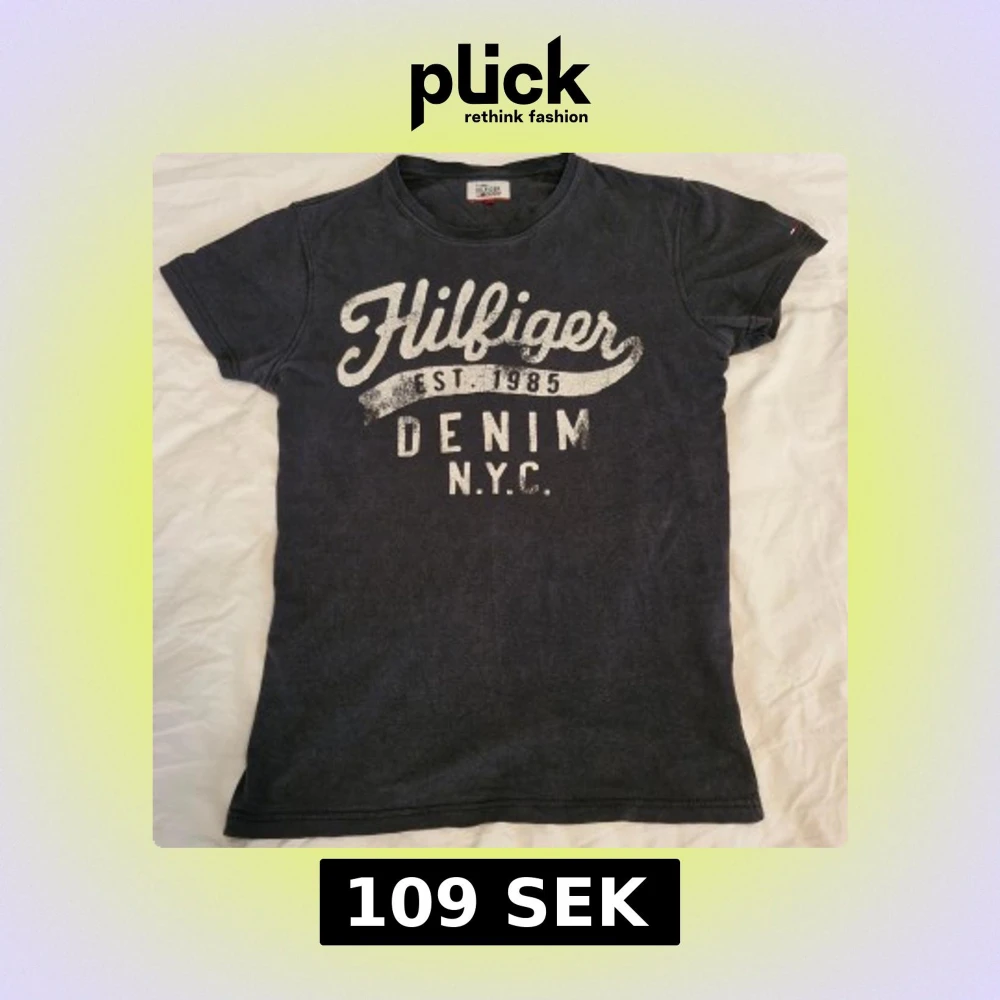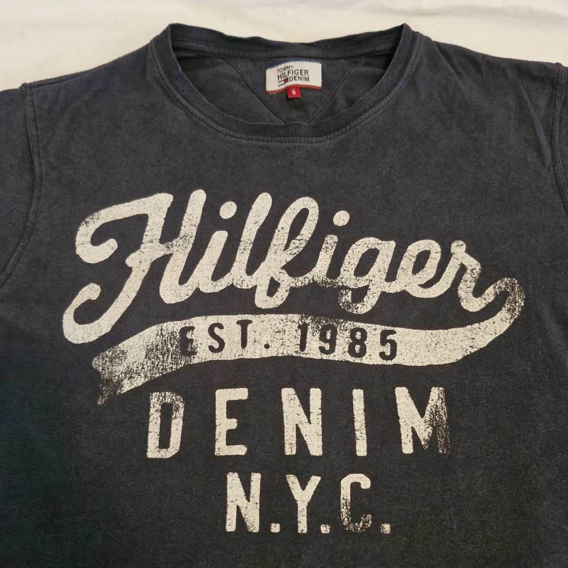 Snygg mörkblå t-shirt från Tommy Hilfiger Denim med stort vitt tryck på bröstet och klassisk rund hals. Kortärmad modell i mjuk bomull, perfekt för en chill streetstyle-look. Liten Hilfiger-logga broderad på ärmen för extra detalj.