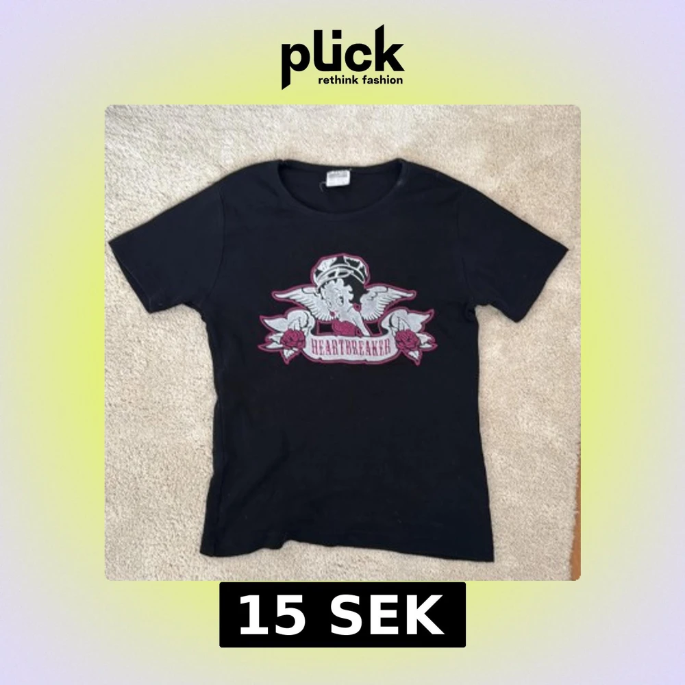 Svart t-shirt från James & Nicholson med Betty Boop-tryck och texten 'Heartbreaker' framtill. Coolt motiv med vingar, rosor och detaljer i grått och rosa. Rund hals och korta ärmar, tillverkad i mjuk bomull. Perfekt för dig som gillar statement-plagg och retro vibes.