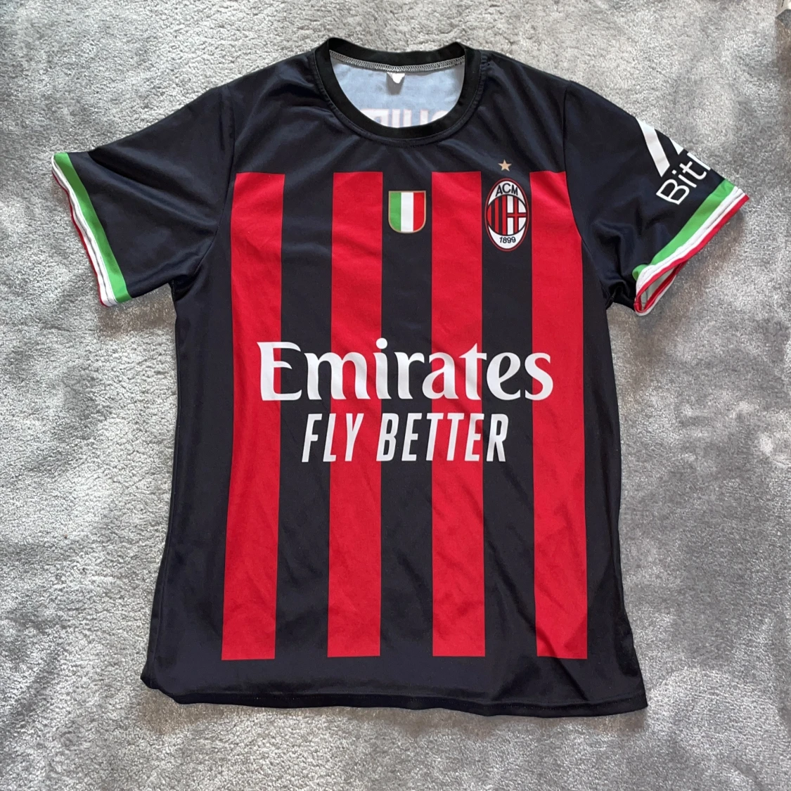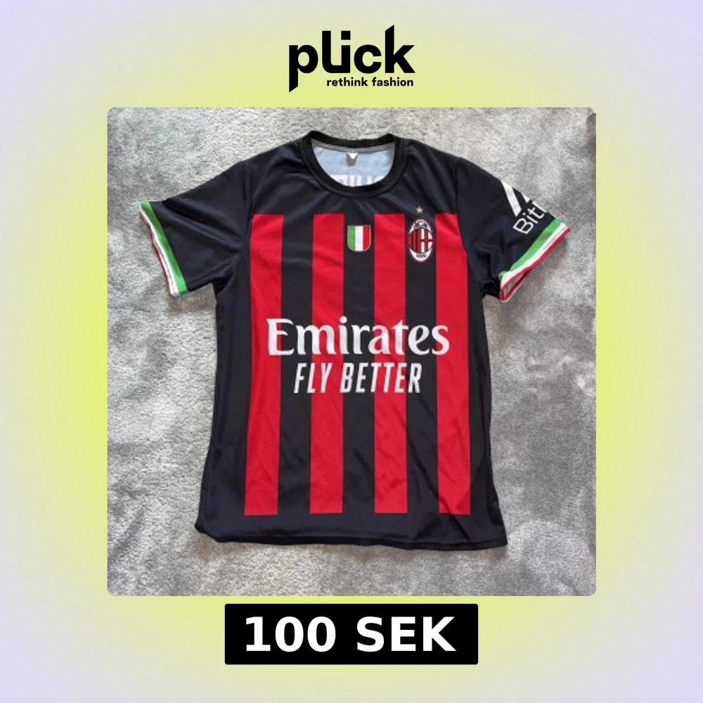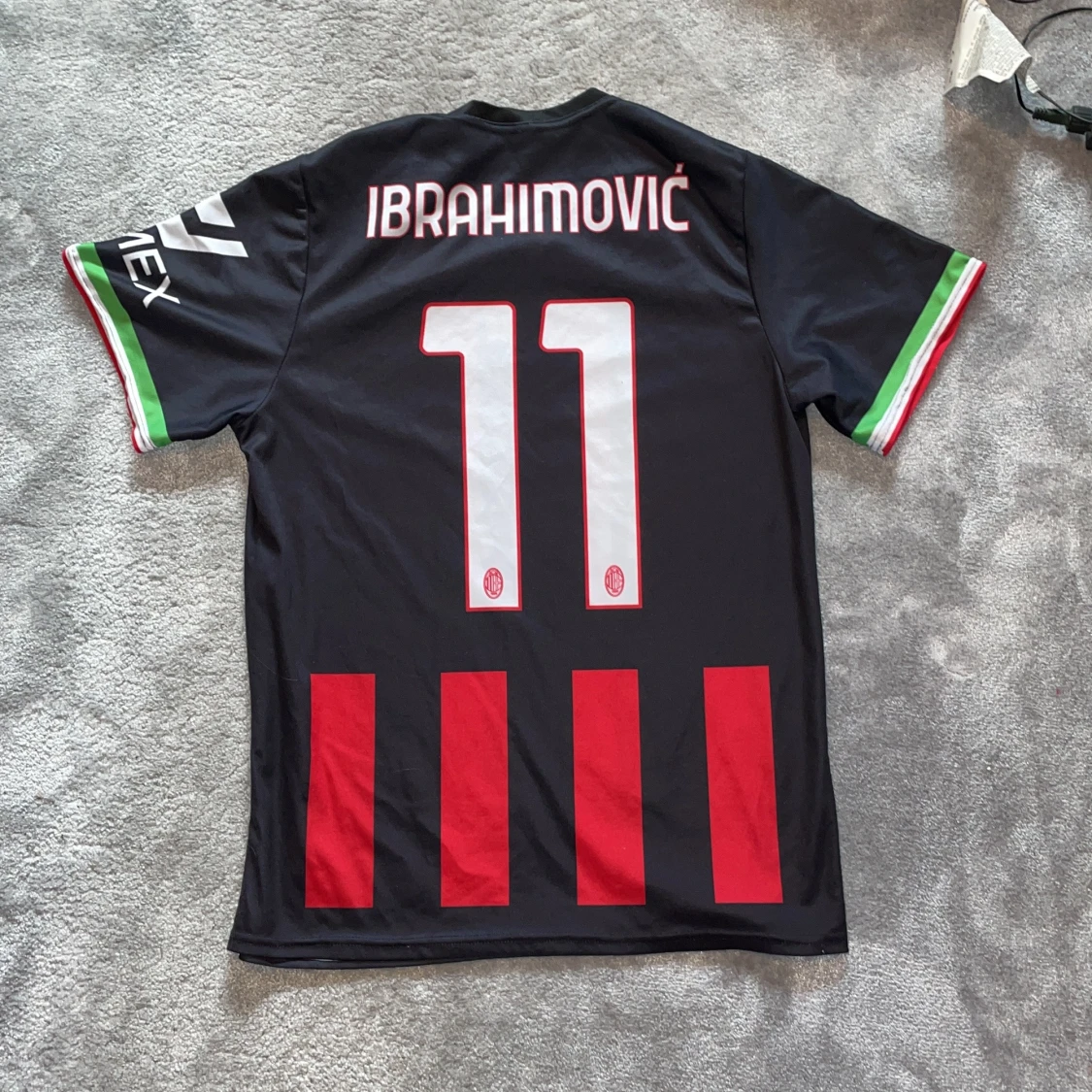 Säljer en AC Milan fotbollströja med Ibrahimović och nummer 11 på ryggen. Tröjan är svart med röda vertikala ränder, klubbmärke och sponsortryck framtill. Ärmarna har gröna, vita och röda detaljer. Tillverkad i lätt och ventilerande polyester.