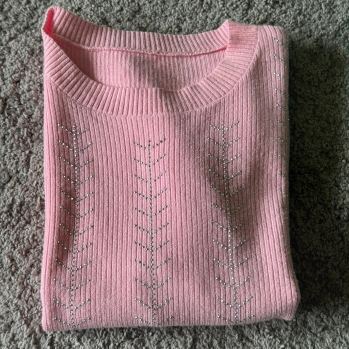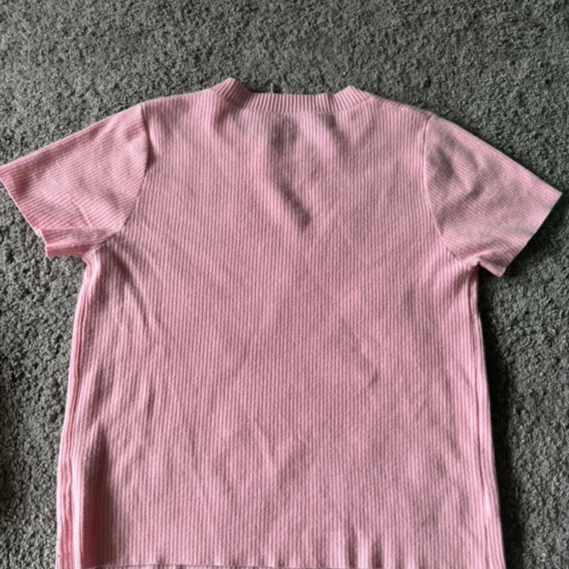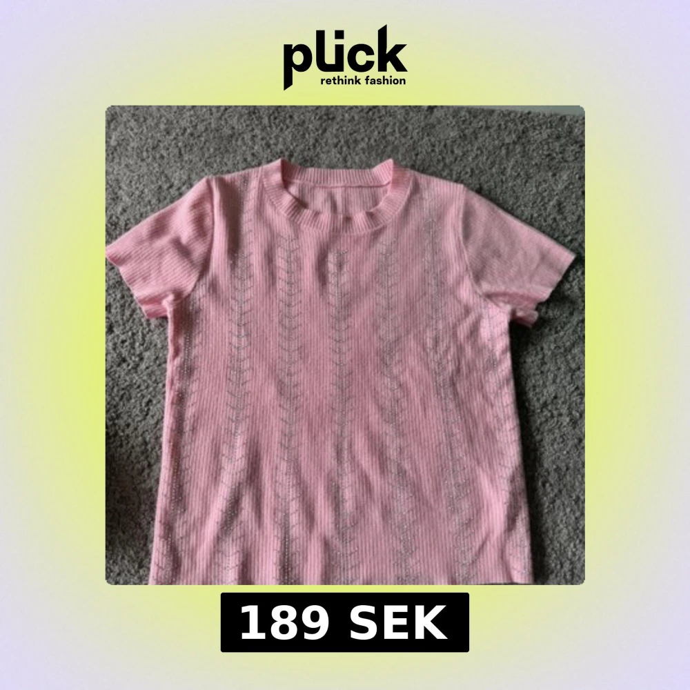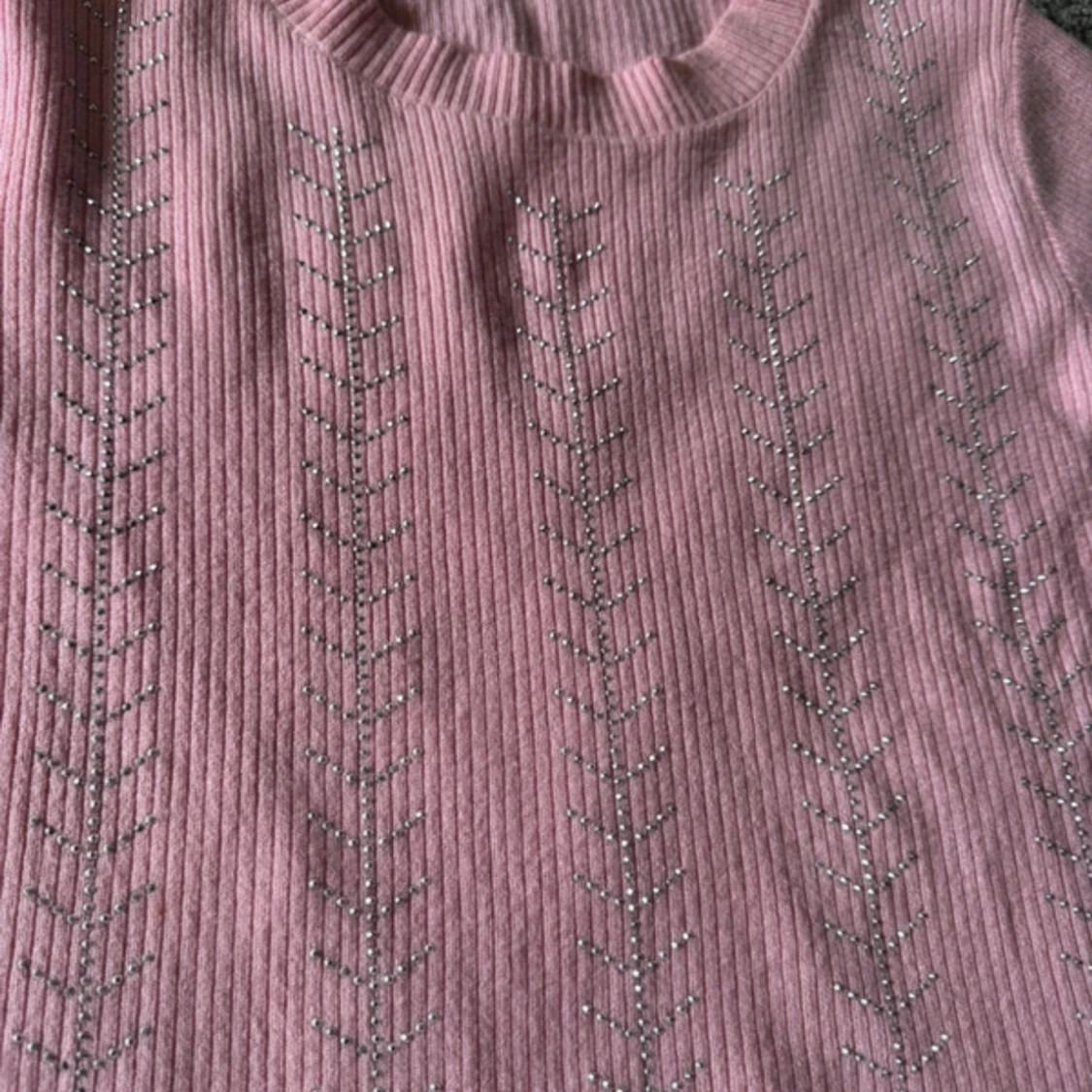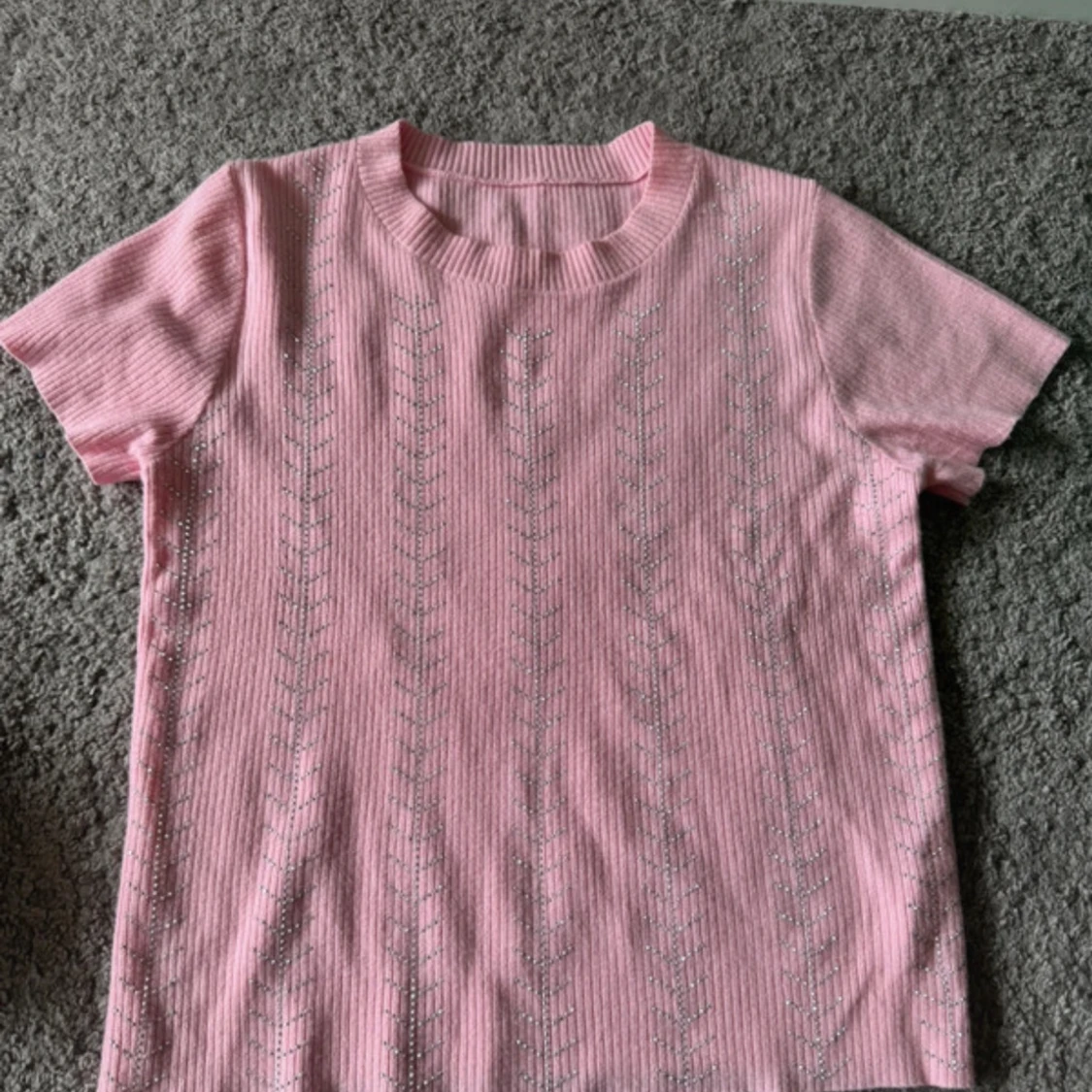Snygg rosa t-shirt med ribbad struktur och korta ärmar. Framsidan har vertikala rader av små silverfärgade pärlor som ger en unik och cool look. Materialet känns mjukt och stretchigt, perfekt för dig som gillar bekväma och trendiga plagg.