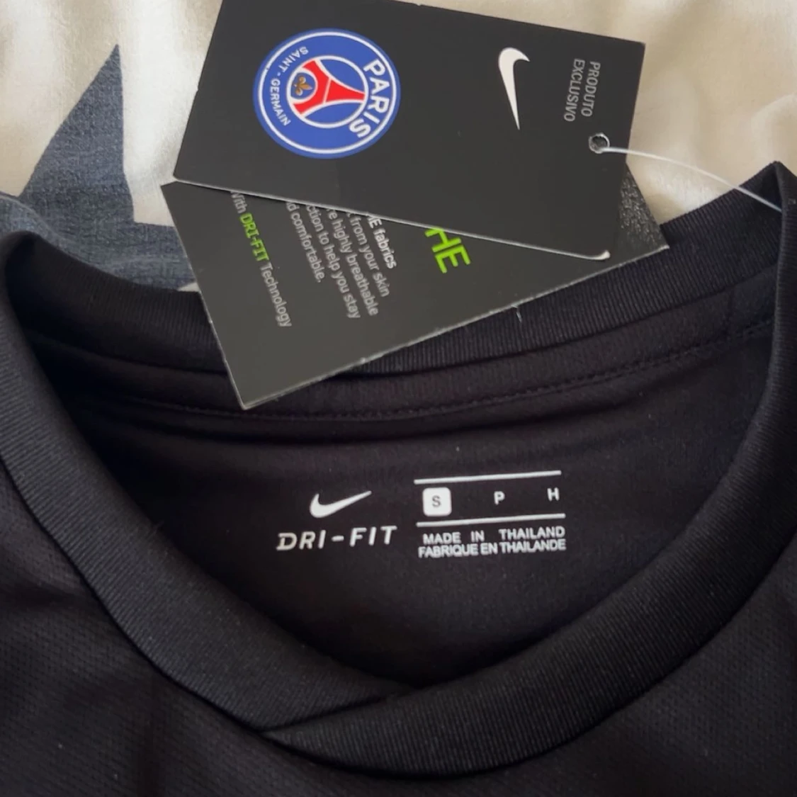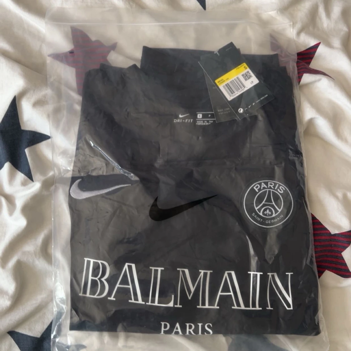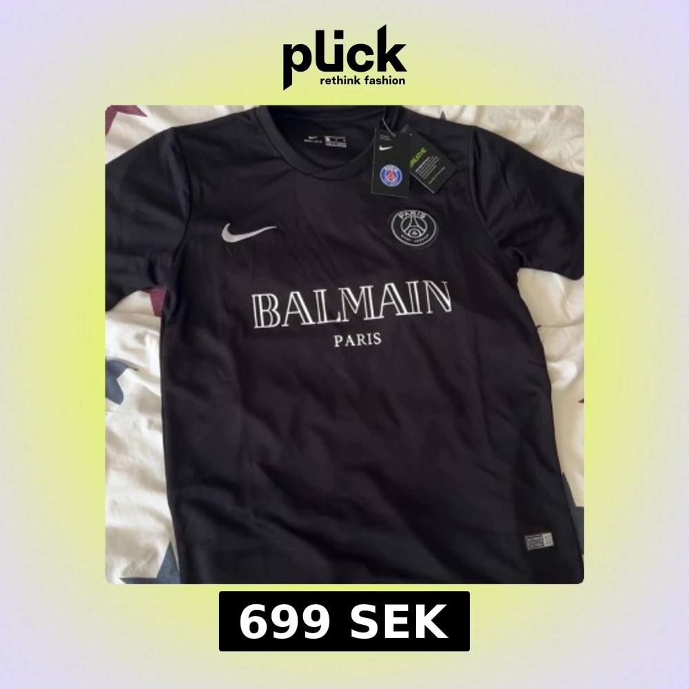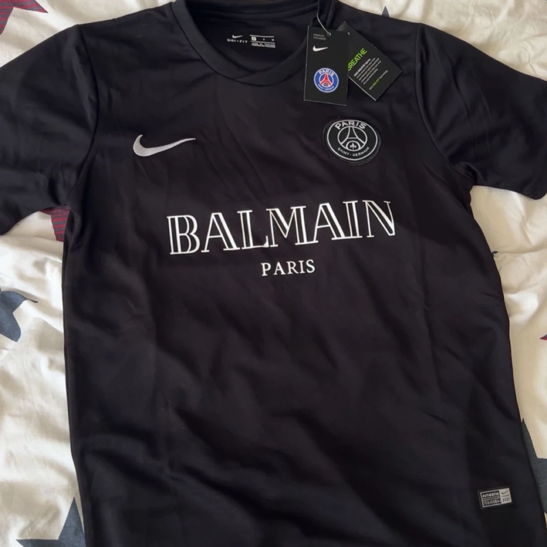 Svart PSG x Balmain Paris fotbollströja från Nike med Dri-FIT-material. Klassisk rund hals, korta ärmar och tydliga vita tryck med Balmain-logga och PSG-emblem på bröstet. Snygg och stilren design, perfekt för dig som gillar exklusiva samarbeten.