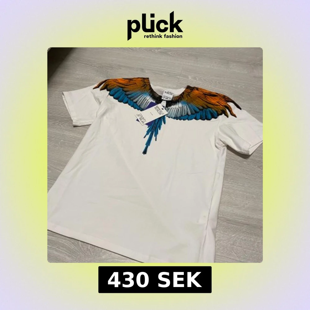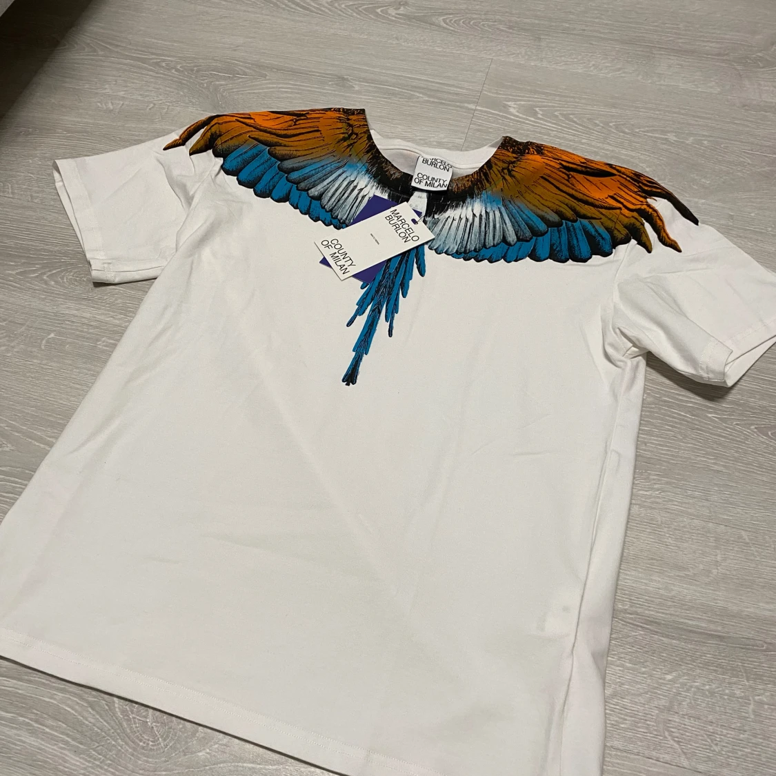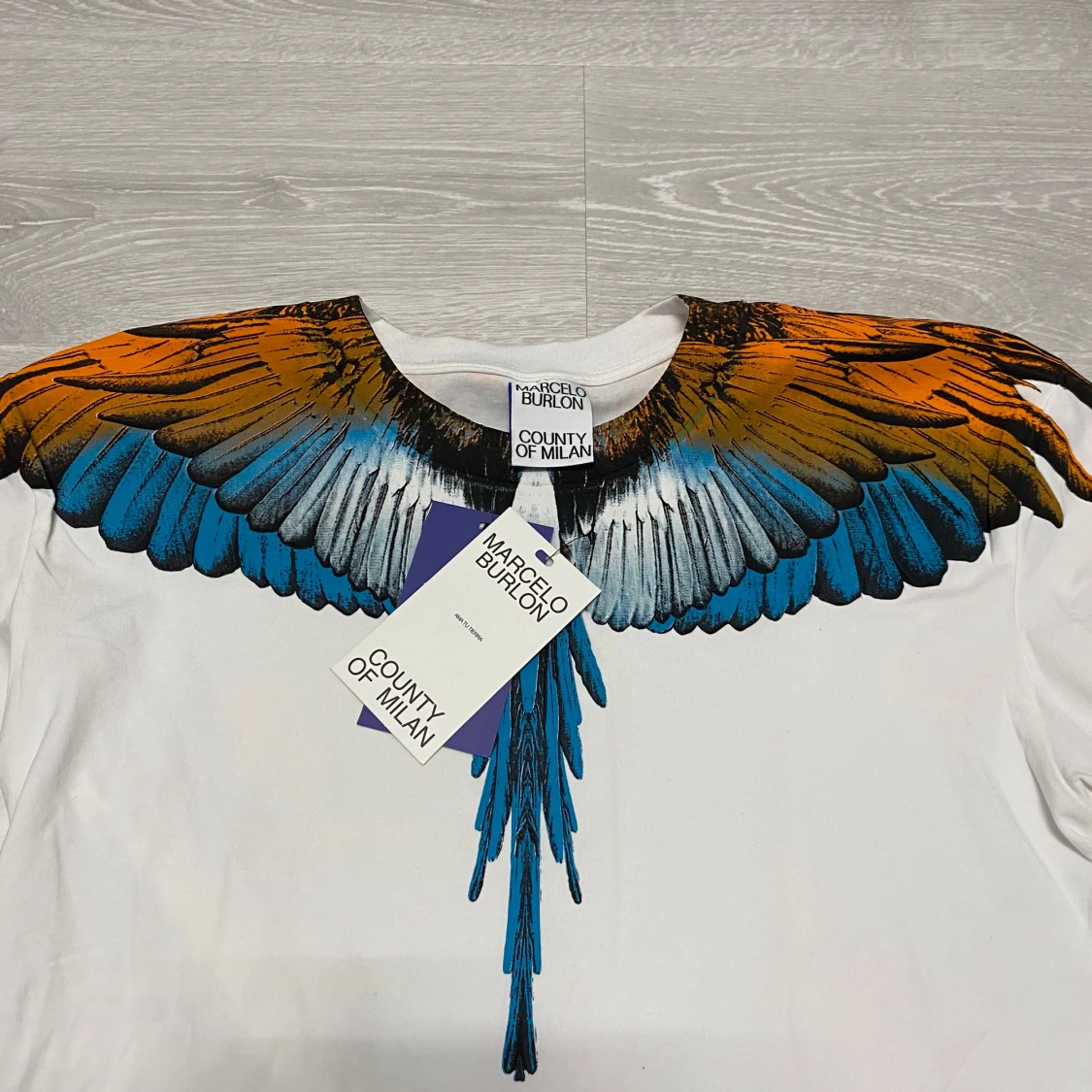 (Passar folk har har storlek M också) Säljer en vit Marcelo Burlon t shirt med ikoniskt vingtryck i orange, blått och svart över axlar och bröst. T-shirten har rund halsringning och korta ärmar. Materialet är mjuk bomull och passformen är normal. Perfekt statement-plagg för dig som gillar unika prints.