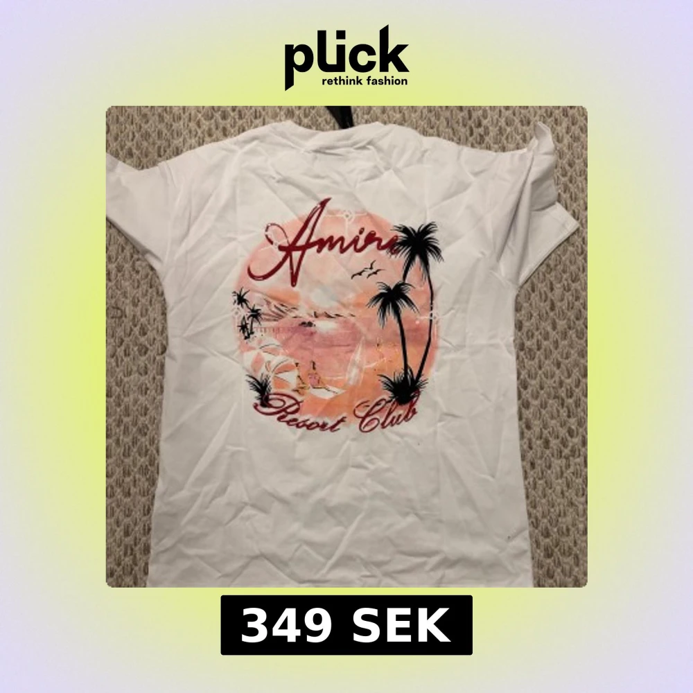 Vit t-shirt från Amiri med tryck i rosa och svart på ryggen som visar en strand med palmer och surfare. Framsidan har en mindre Amiri-logga i rött och rosa. Klassisk passform och korta ärmar, perfekt för en chill sommarlook.