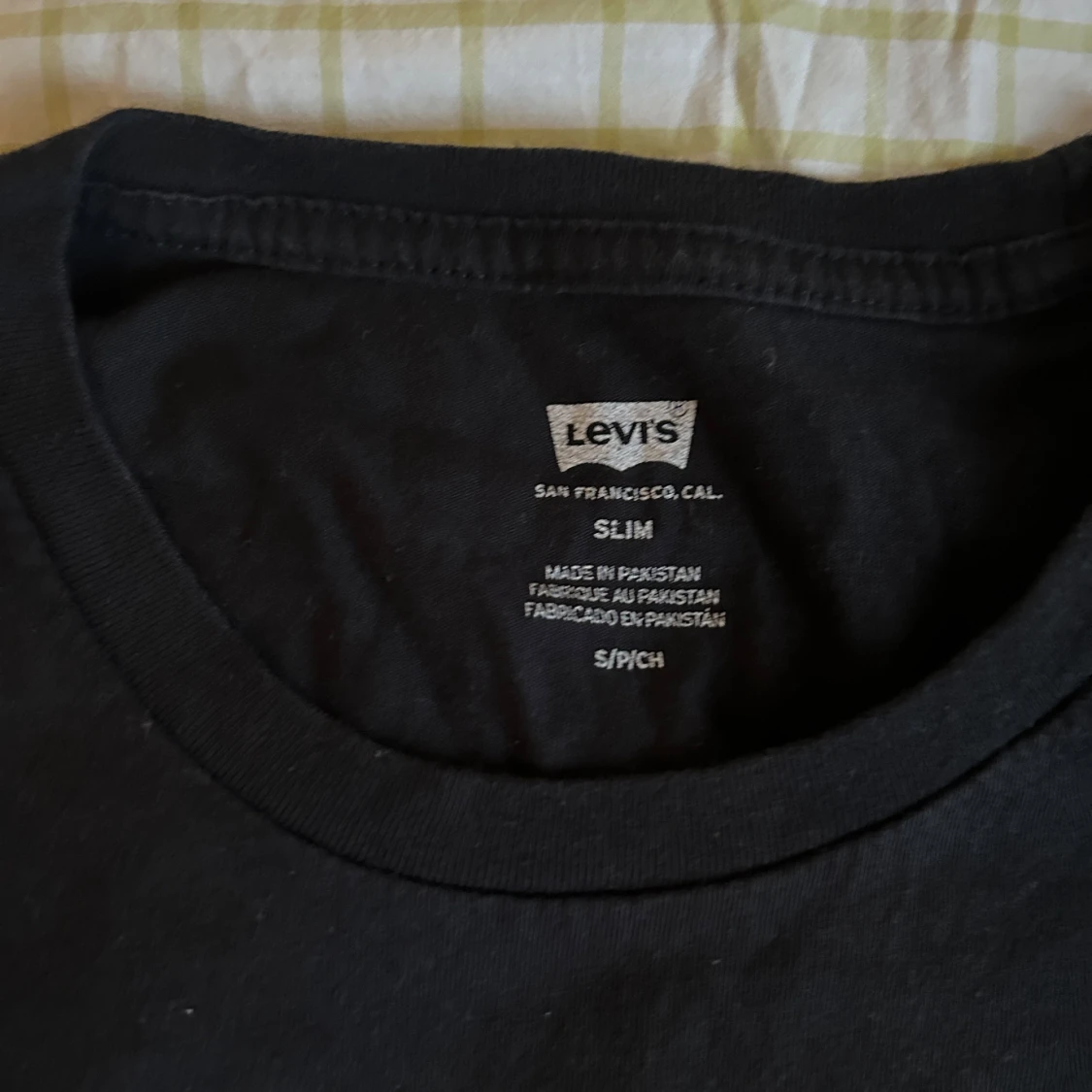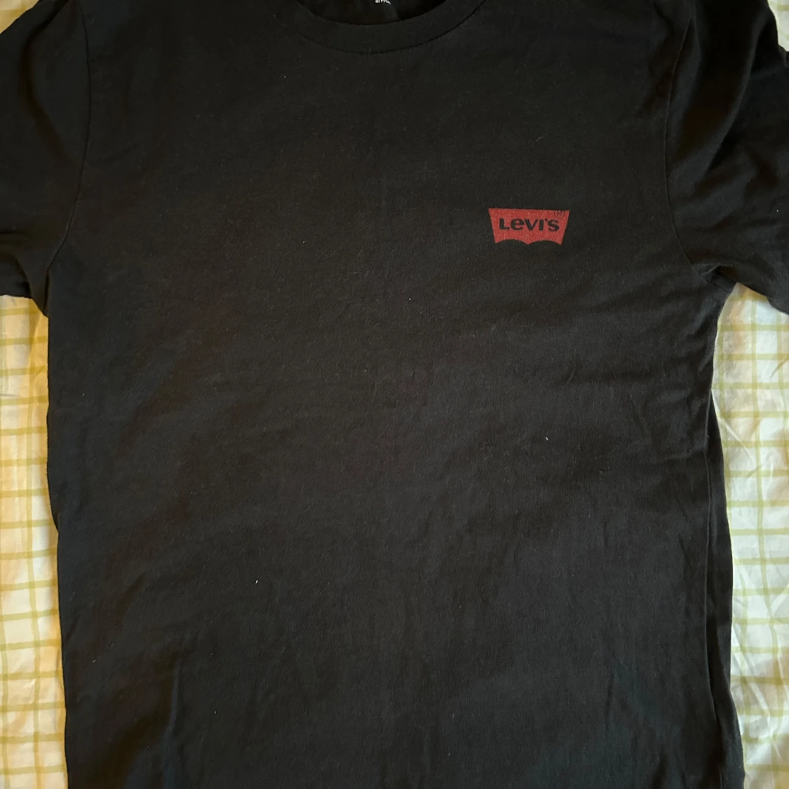Säljer en svart t-shirt från Levi's med röd logga på bröstet. T-shirten har en slim passform och är kortärmad, perfekt för en stilren look. Storlek S men passar Xs